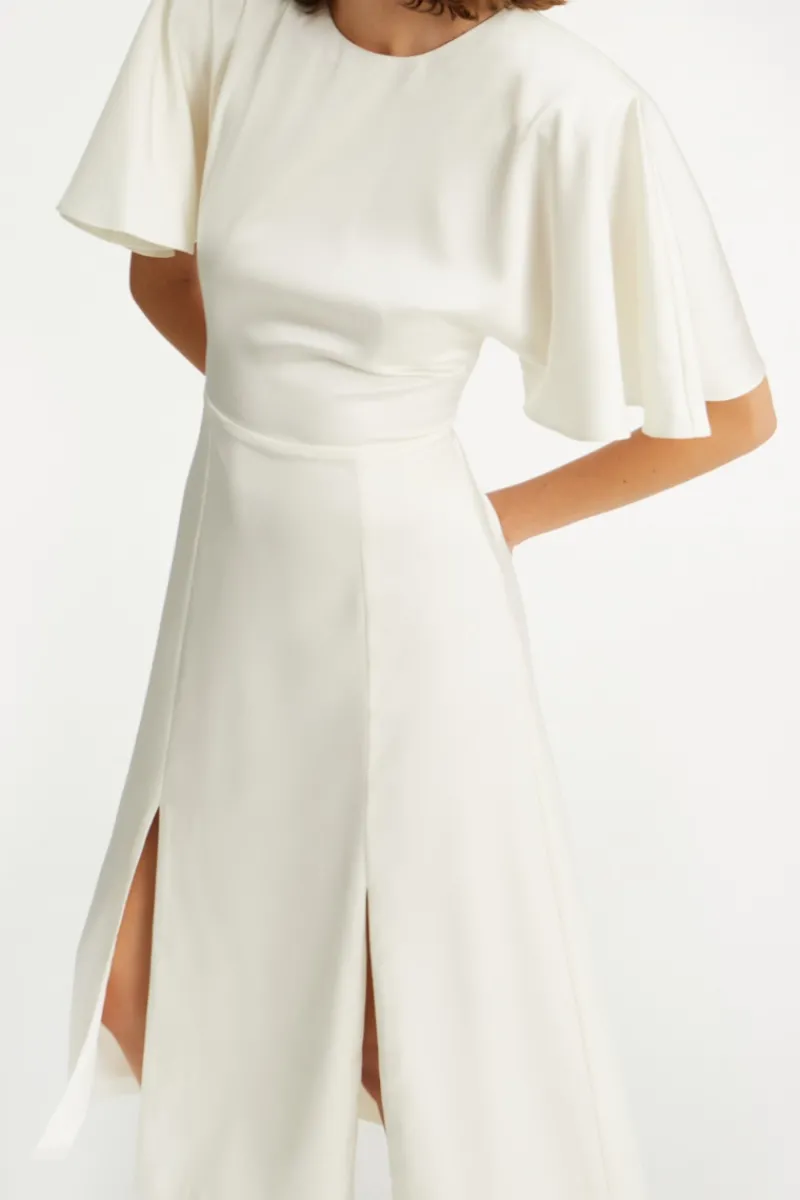 The Satin Midi Slit Dress is cut from lustrous satin in a fitted silhouette with a subtle side slit. Designed with a straight neckline and slim straps, this style flows to a calf-grazing hem for elegant movement.
