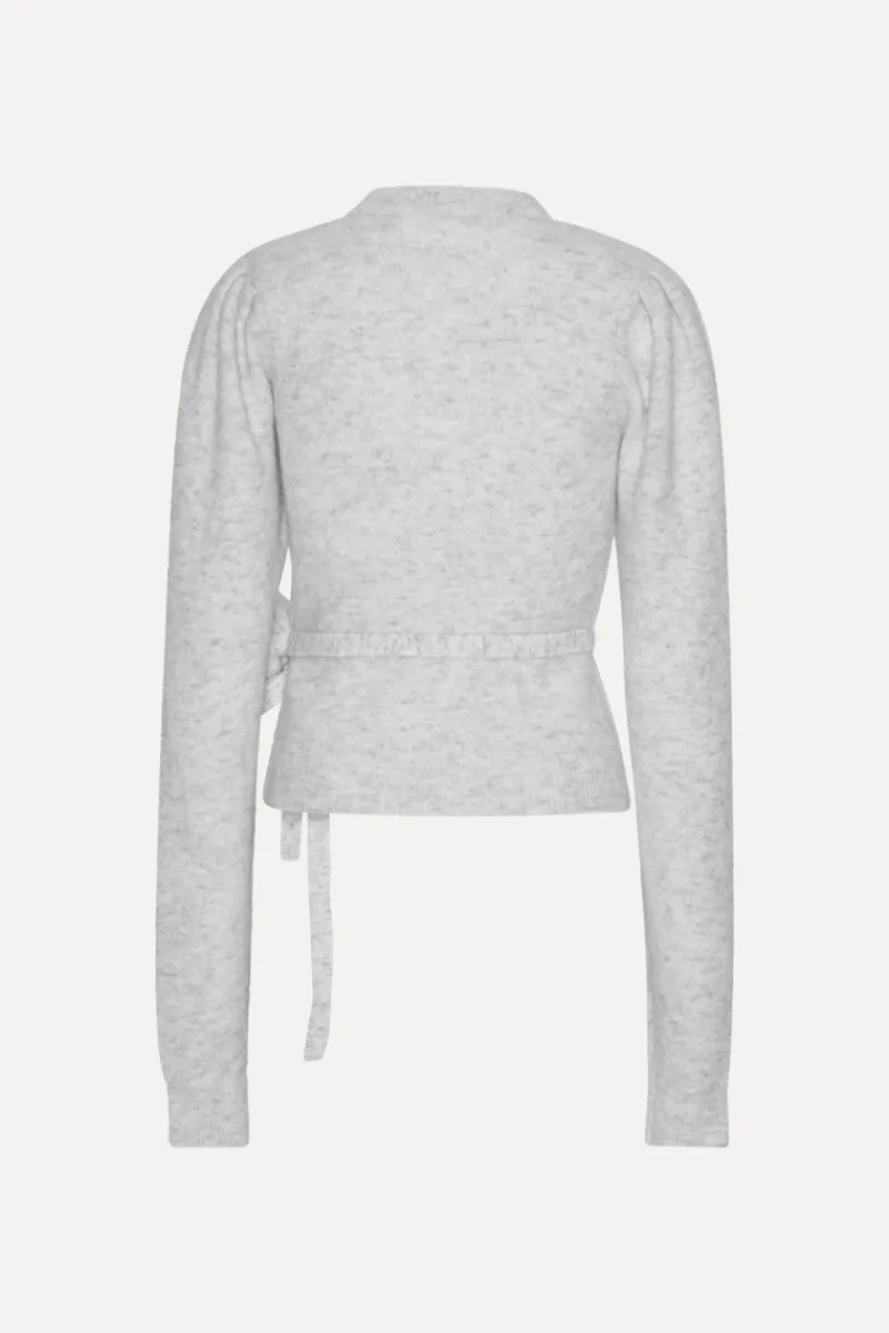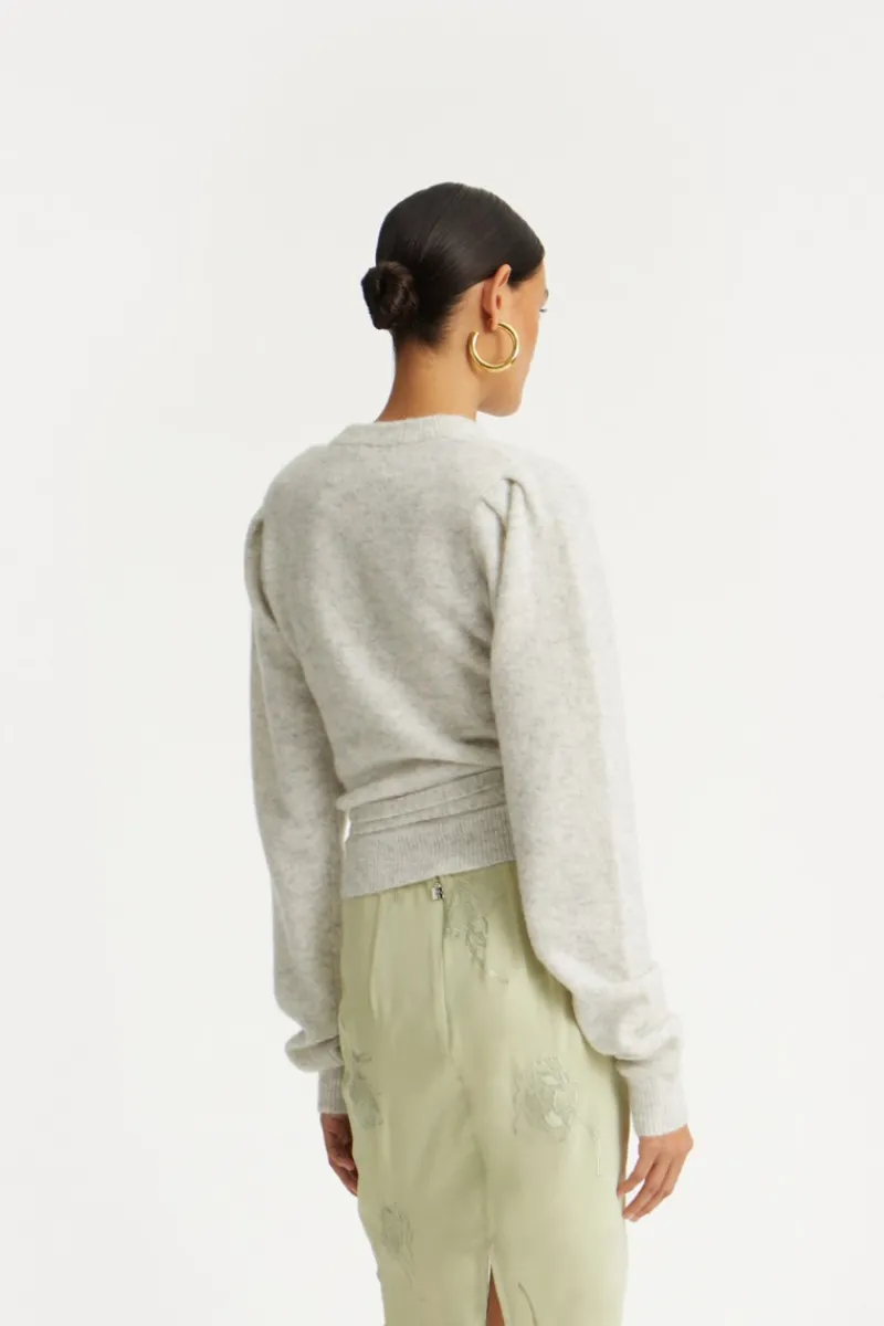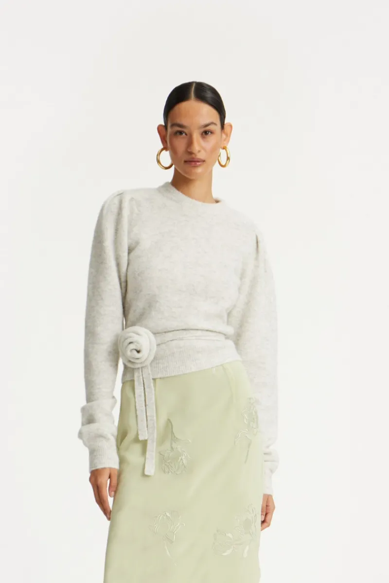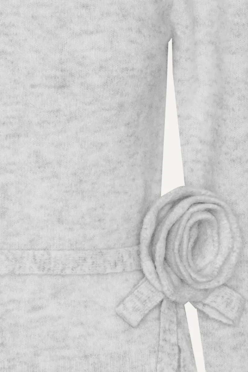 Knit Puff Crewneck Light Grey features a classic crew neckline and long sleeves with subtle puff details at the shoulders. The fitted waist is accentuated by a thin knit belt with a decorative rosette on the side. Ribbed cuffs and hem add structure, while the soft knit fabric ensures a comfortable feel.