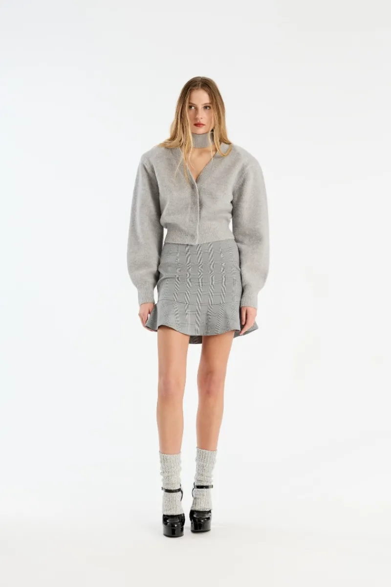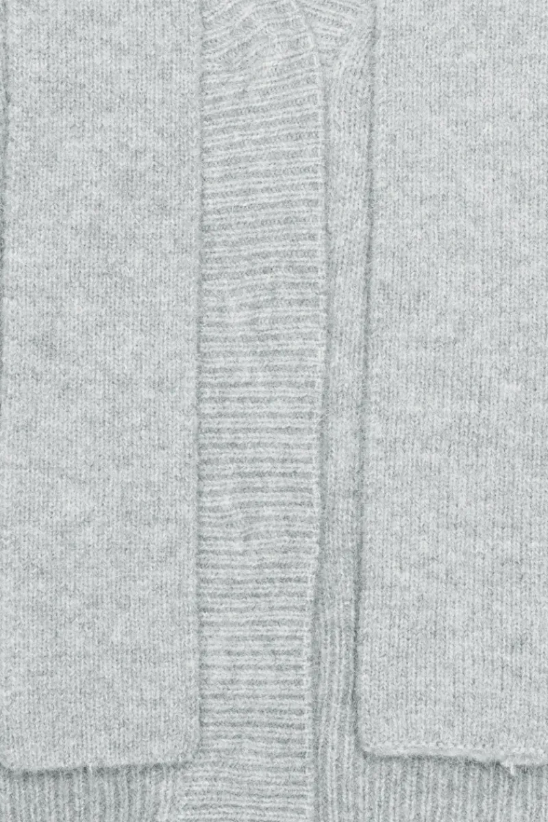 Knit Scarf Cardigan Light Grey is a slightly cropped knit cardigan with a deep V-neck, wide shoulders, and a matching removable scarf. Crafted from a soft wool and alpaca blend with ribbed hem and cuffs.
