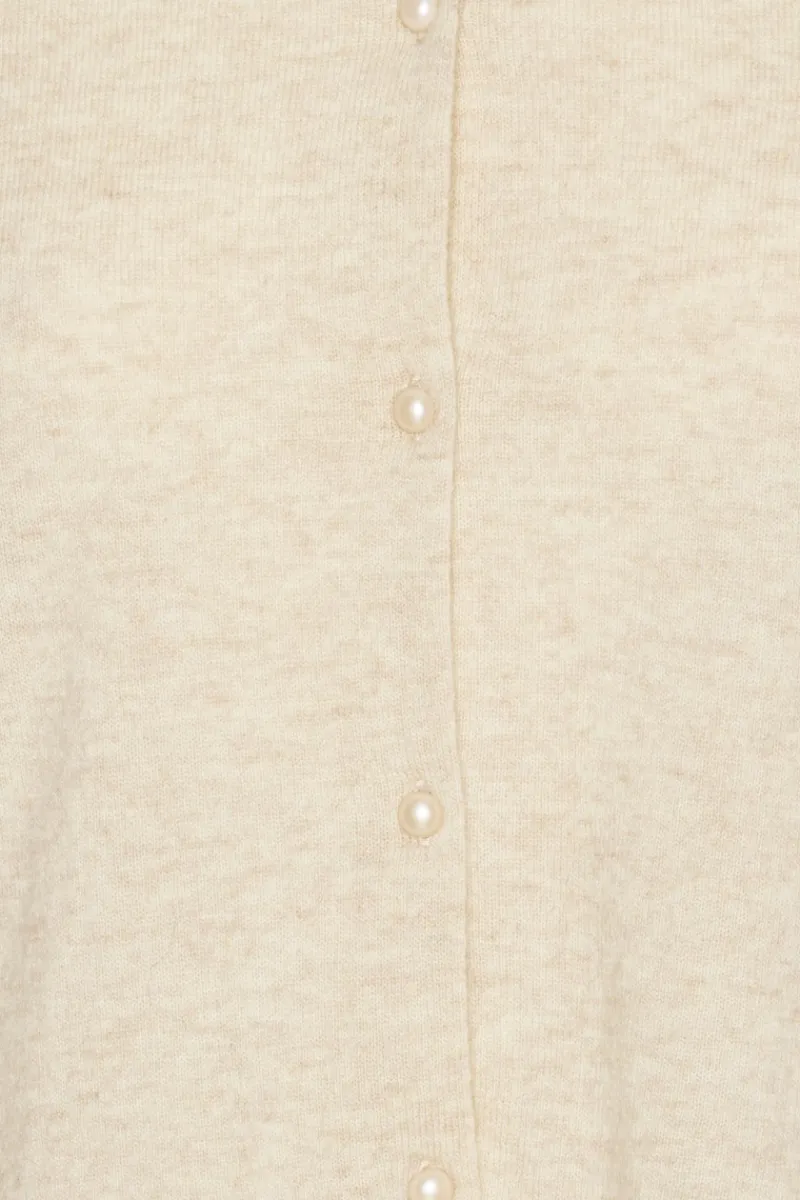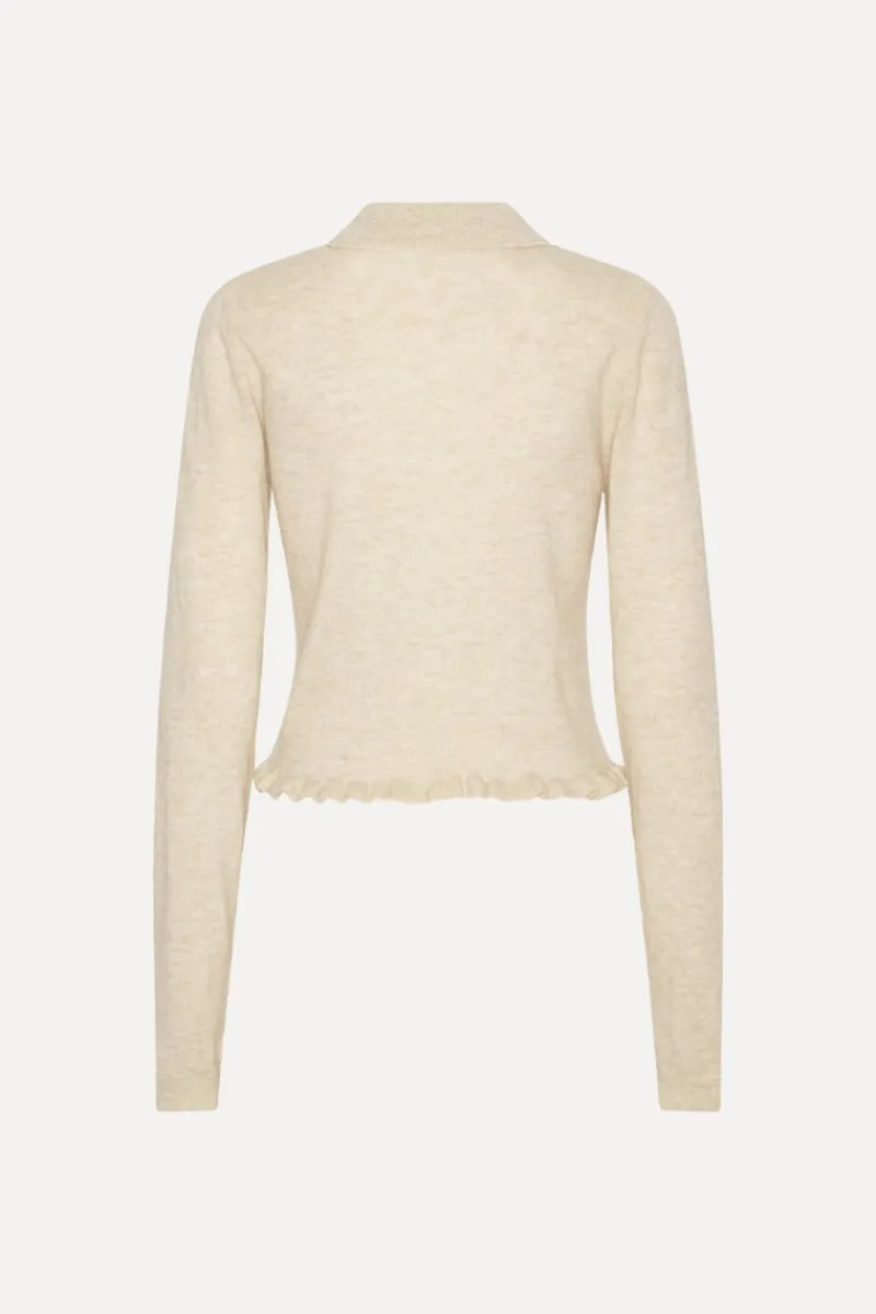 Knitted Polo Cardigan Cream is a fitted cardigan featuring a classic polo collar and a buttoned front. It has long sleeves and a softly flounced hem that adds a delicate finish to the silhouette. The fine knit creates a light and even appearance. The cardigan is knitted from a soft wool and cashmere blend and is unlined.