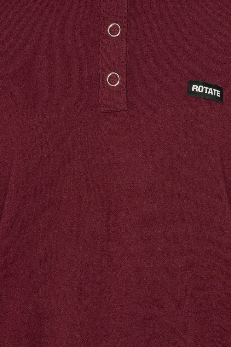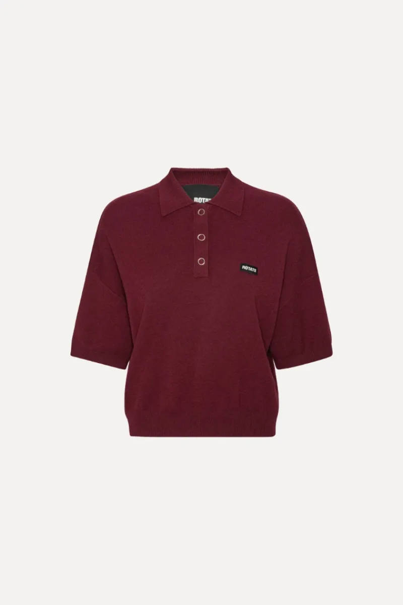 The Slinky Knit Polo features a relaxed silhouette with short sleeves, a classic collar, and a front placket with three metallic eyelet buttons. Ribbed trims at the cuffs and hem complete the style, along with a ROTATE logo patch on the chest.