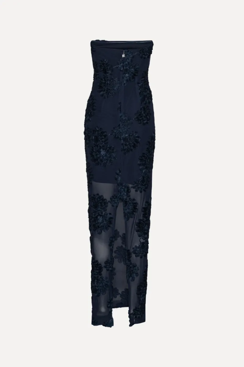 The 3d Mesh Maxi Dress features a strapless neckline and a fitted silhouette. It is designed with 3D floral appliqués placed throughout the body, adding dimension and texture. The dress has a maxi length with a slit at the back for ease of movement. A hidden zipper is placed at the back for closure.
