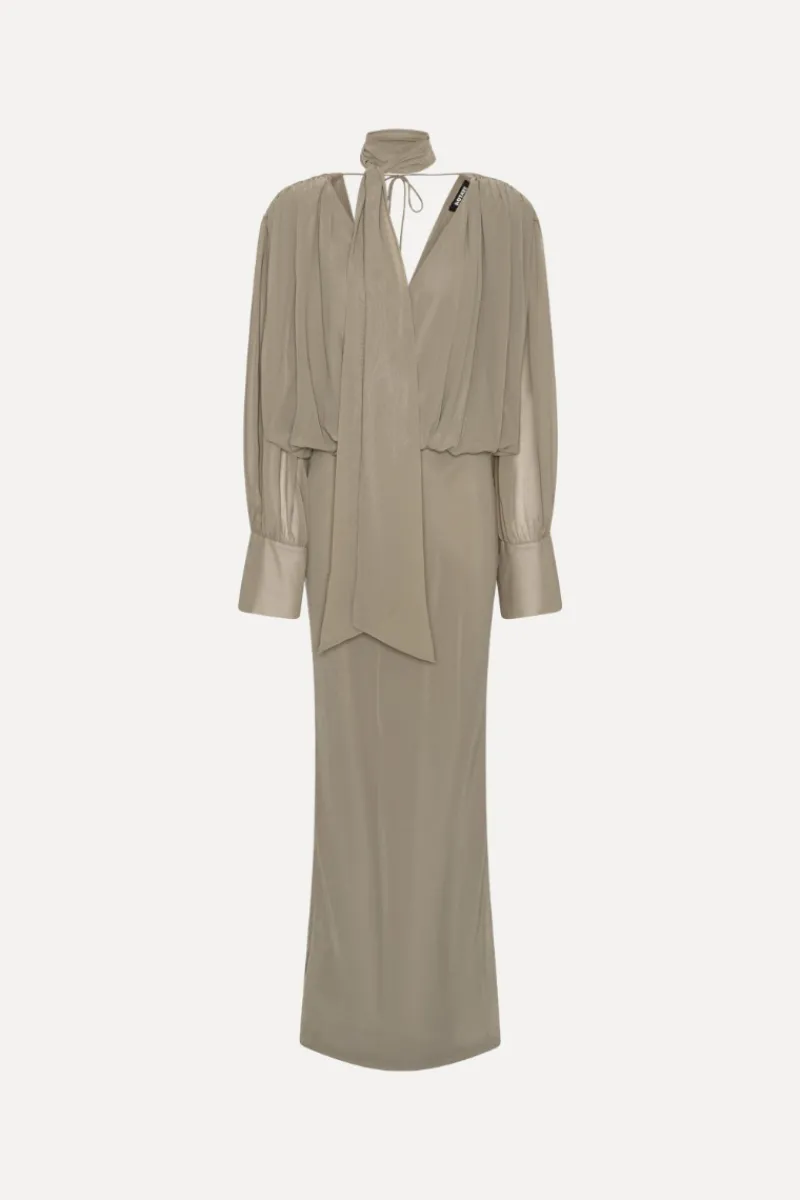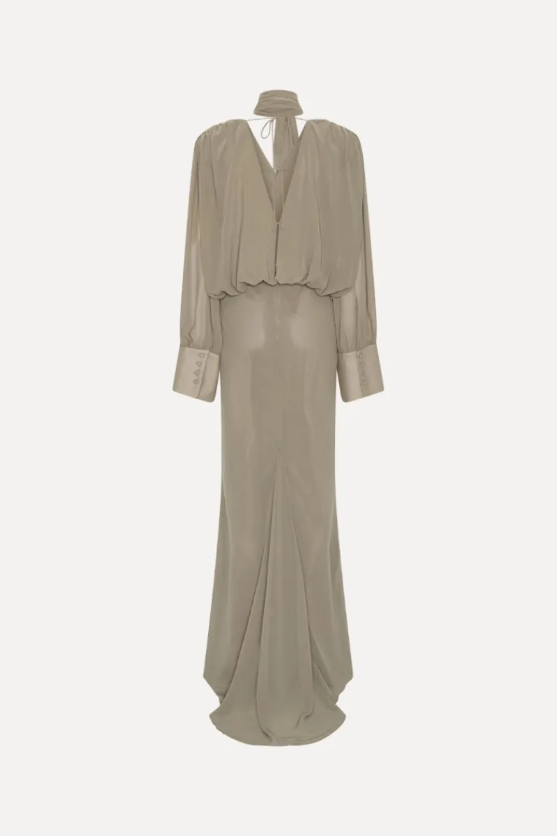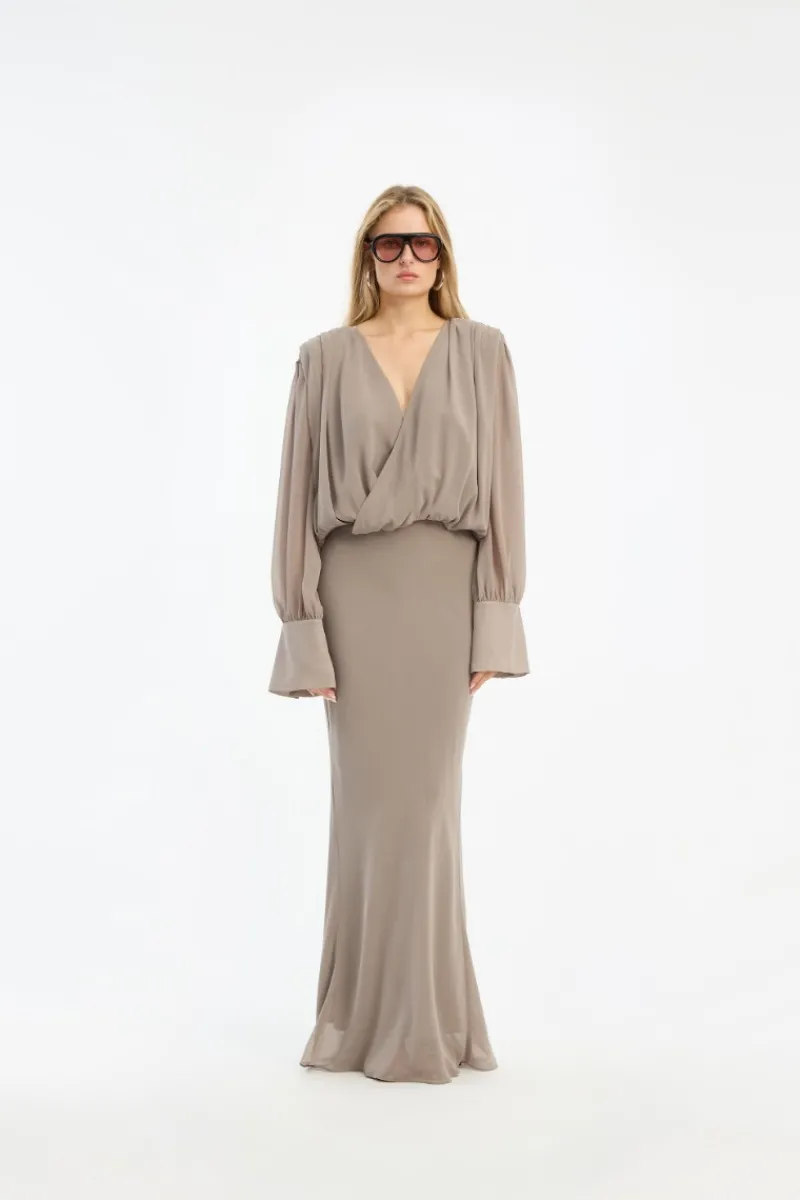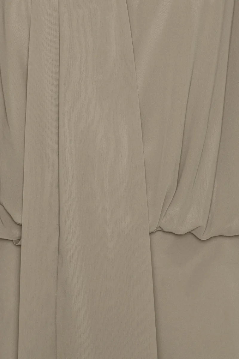 Chiffon Ls Maxi Dress Taupe is designed in a soft taupe tone with a long, elegant silhouette. The dress features a deep V-neckline with a wrap-style front and long, flowing sleeves finished with wide cuffs. The upper body has softly draped chiffon detailing, while the skirt falls straight and fluid to a maxi length. A long tie detail at the neckline extends down the front, adding movement and a refined finish. Crepe de Chine is a lightweight, smooth satin-like fabric with a soft drape, subtle matte texture, and gentle crinkled finish that feels fluid and elegant against the skin. The dress is lined.