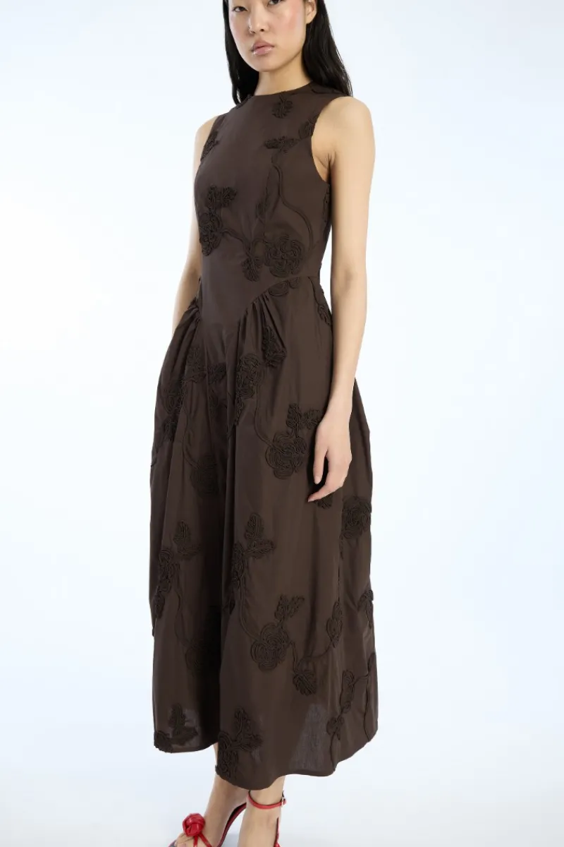 Flower Midi Dress Dark Brown is a sleeveless dress with a round neckline, crafted from cotton and decorated with intricate floral appliqués. The fitted bodice flows into a voluminous skirt with soft pleats, creating movement and shape. The dress is lined and features a zipper at the back.