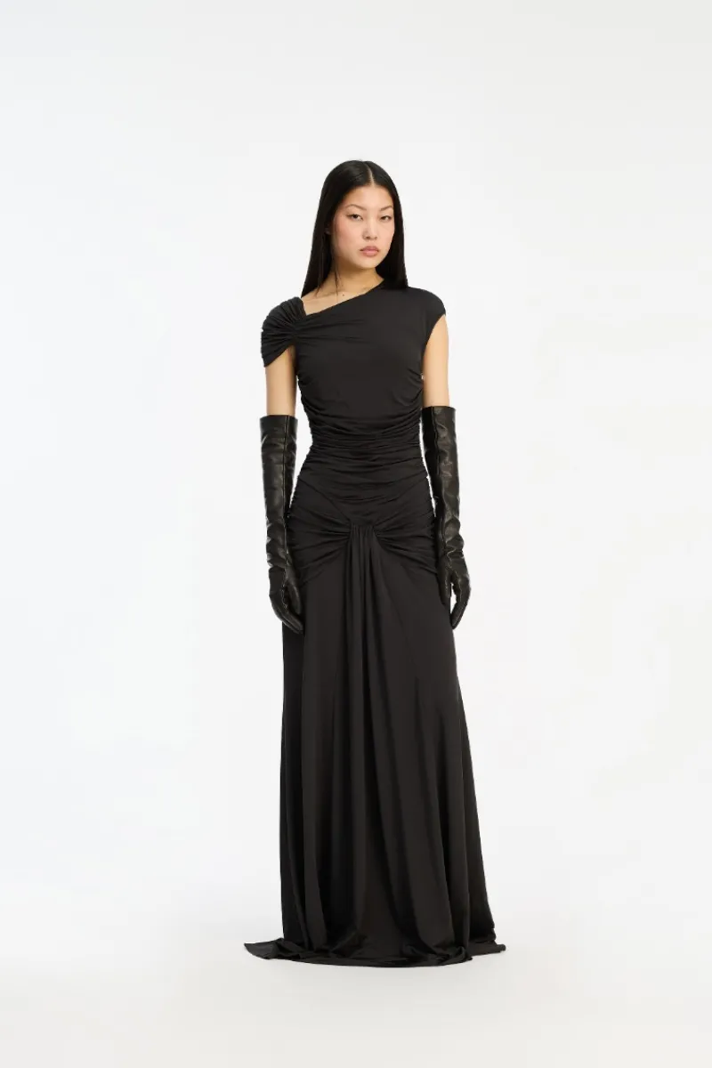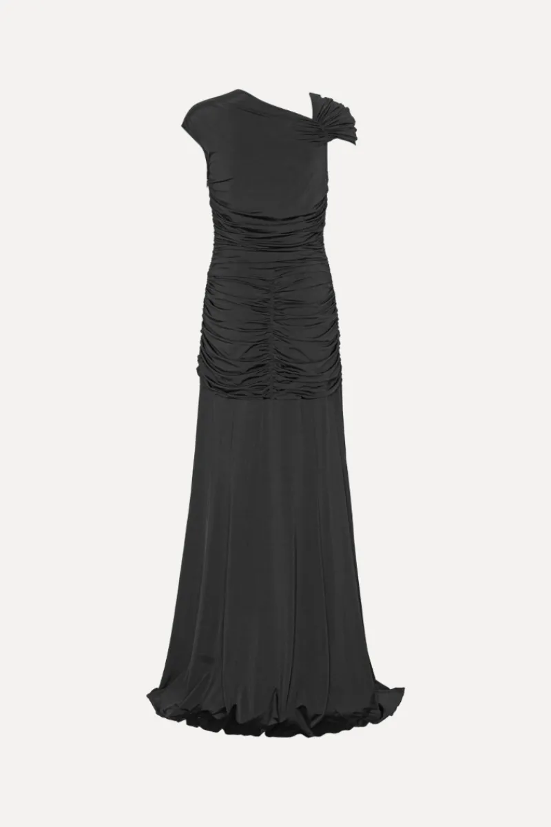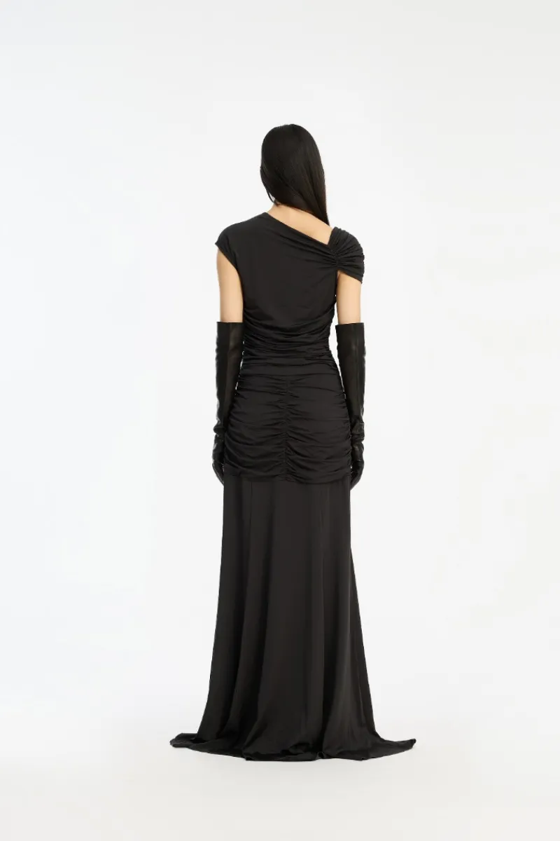 Maxi Asymmetric Dress Black features an asymmetric neckline with one gathered shoulder and a fitted ruched bodice. The skirt flows into a full-length silhouette with soft draping and a bubble-like hem. The back is detailed with gathered ruching across the lower section, adding definition and shape. The dress has lining.