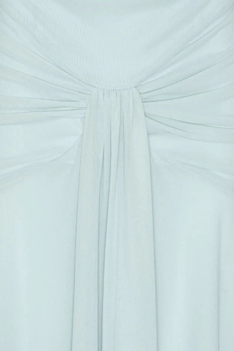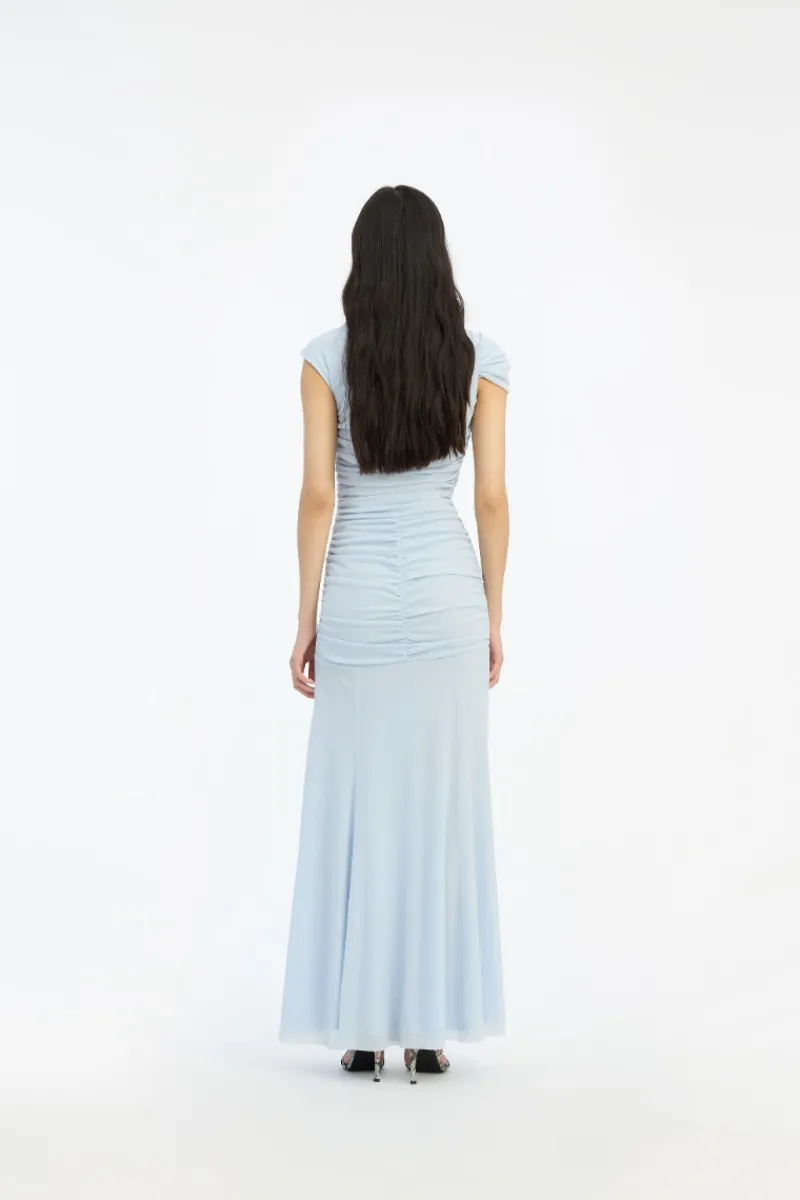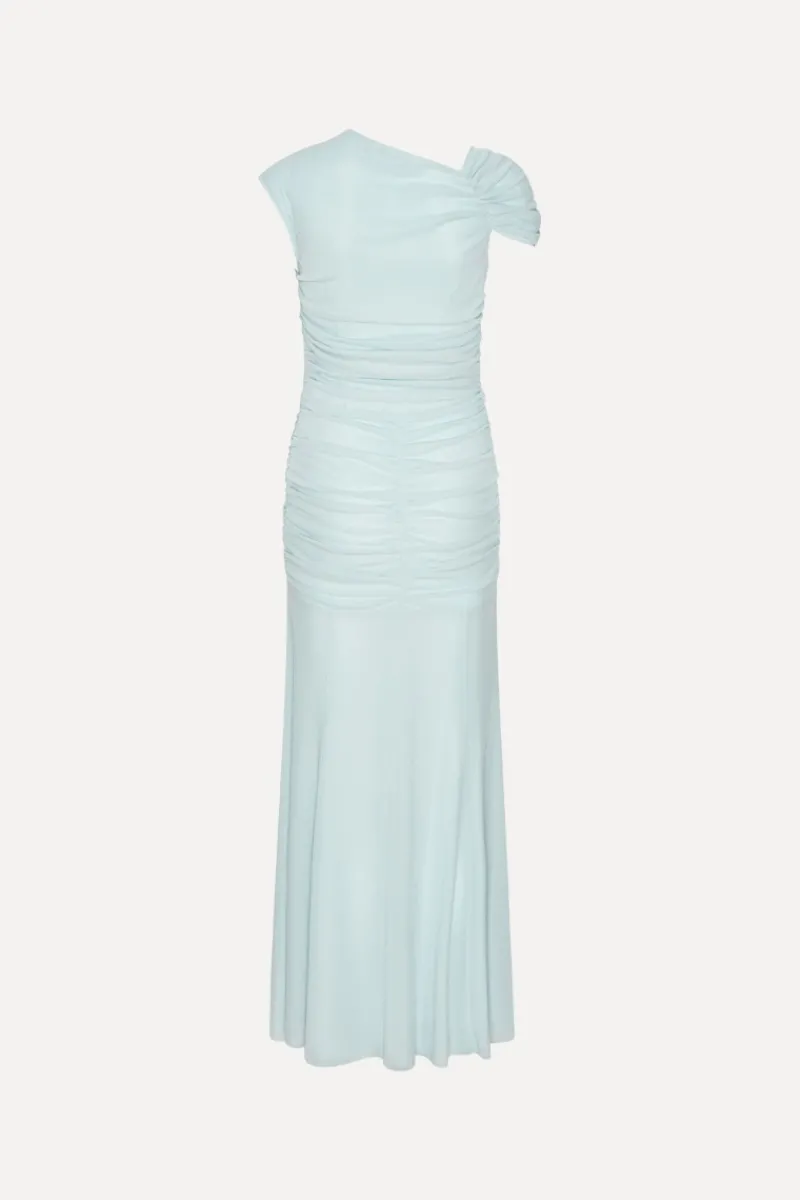 Maxi Asymmetric Dress Light Blue is a one-shoulder maxi dress with an asymmetric neckline and a softly draped silhouette. The design features gathered detailing through the bodice and waist, creating a ruched effect that continues into a fluid, floor-length skirt. A central draped knot detail at the front adds dimension to the silhouette.