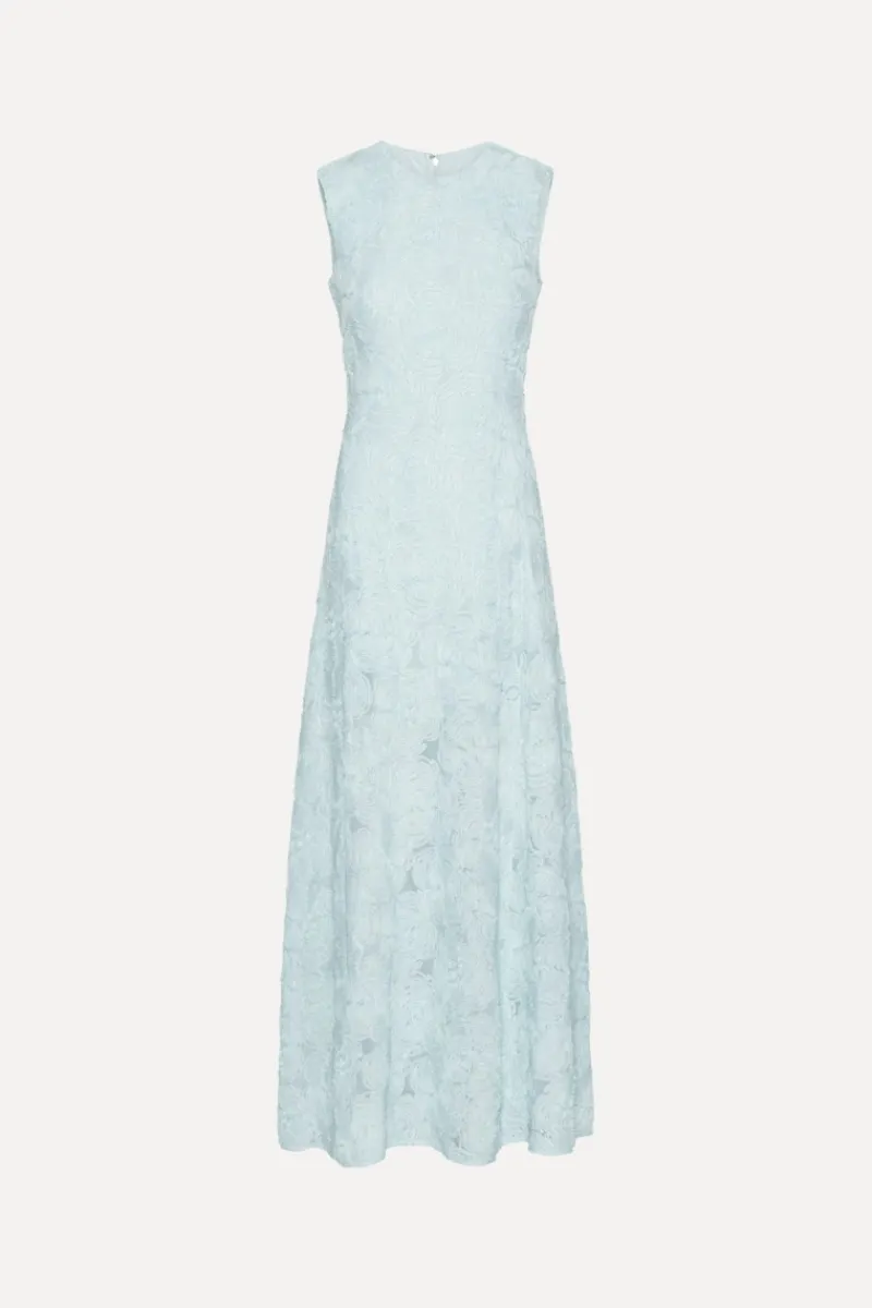 Mesh Maxi Dress Blue is a sleeveless maxi dress with a round neckline and a fitted waist that flows into a softly flared skirt. The design features an all-over textured mesh surface with a floral pattern, creating a light and dimensional appearance. A clean back zip closure completes the silhouette.