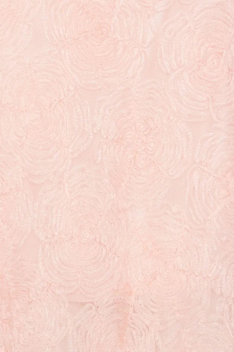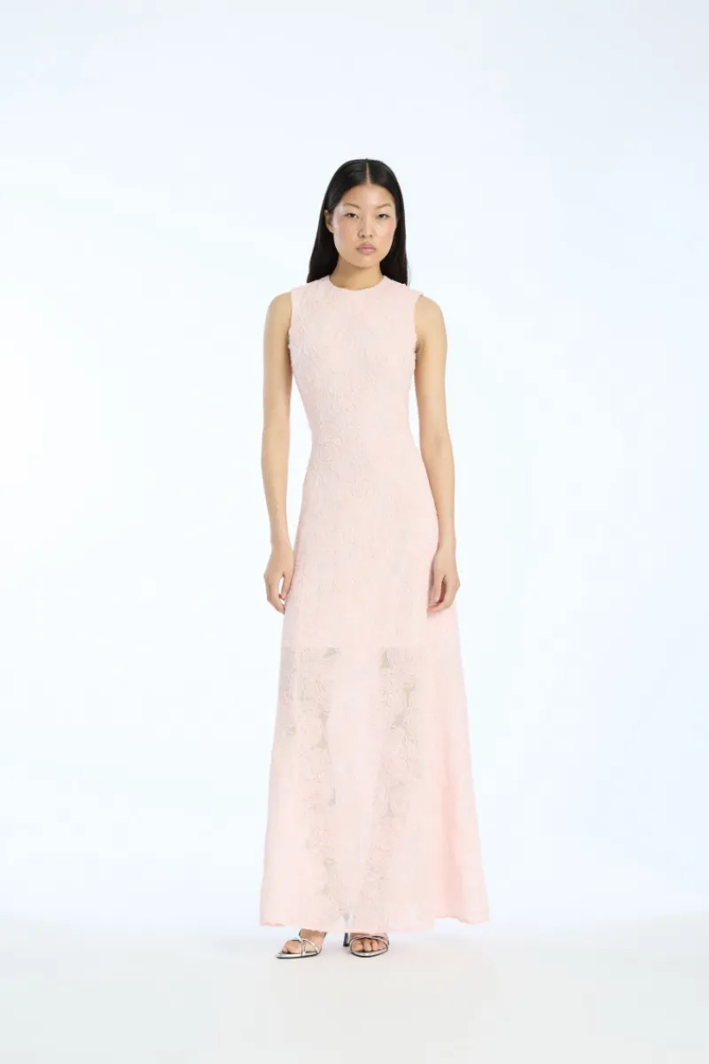 Mesh Maxi Dress Light Pink is a sleeveless long dress with a fitted bodice and a flowing hemline. The dress is crafted from sheer mesh embroidered with tonal floral patterns and features a round neckline. It has lining.