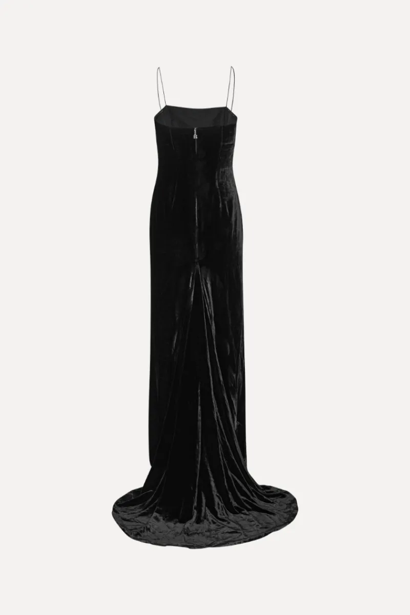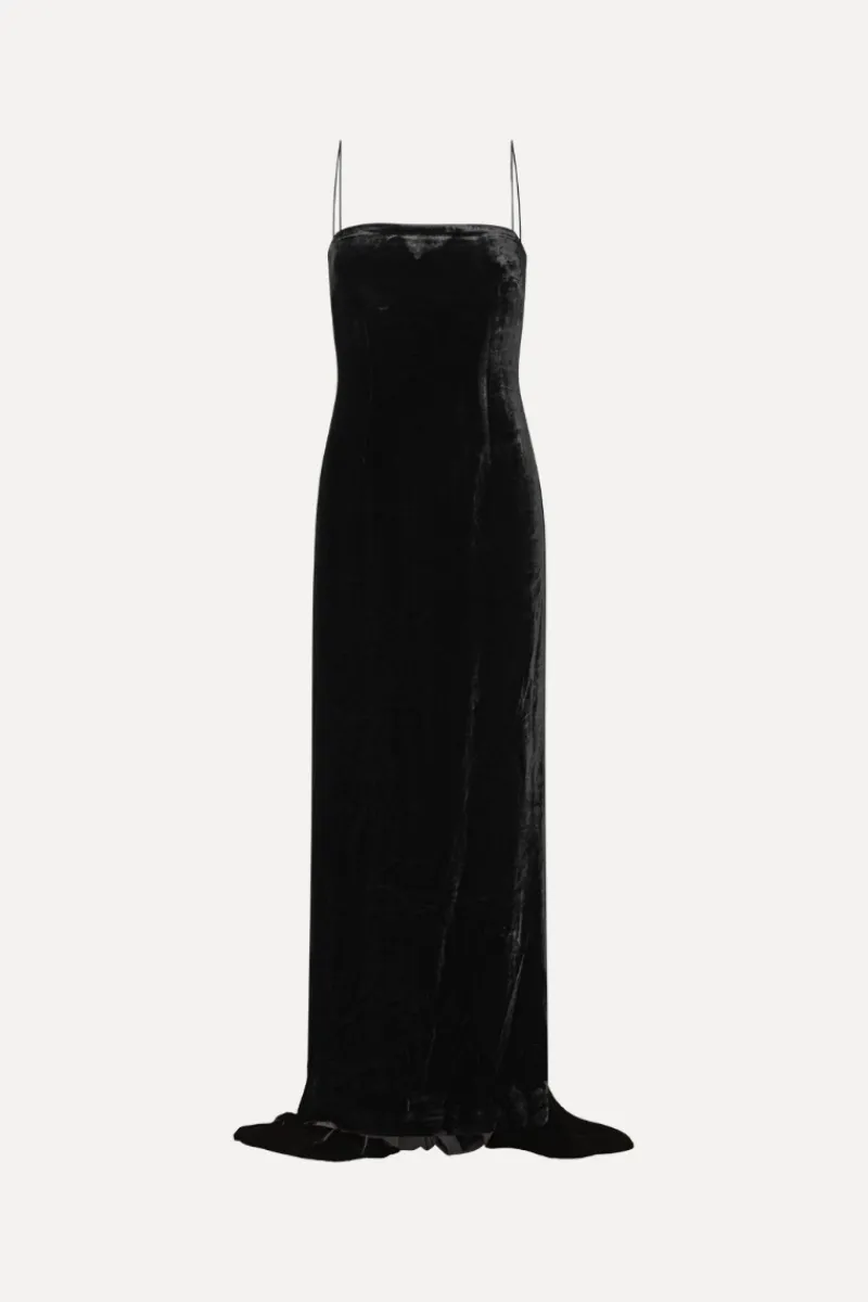 Velvet Maxi Train Dress Black is made from a silk-viscose velvet blend with a floor-length silhouette and a subtle train. It features thin shoulder straps, a square neckline, and a fitted bodice. The dress is lined.