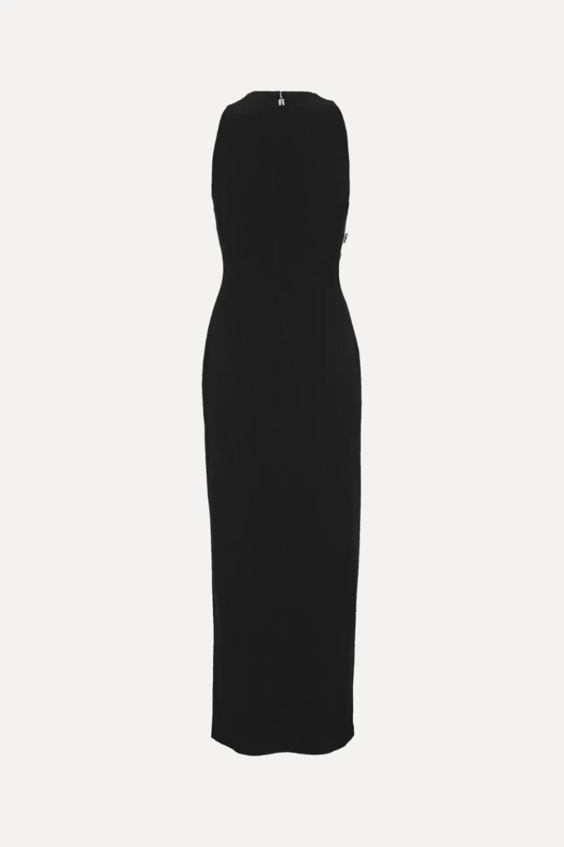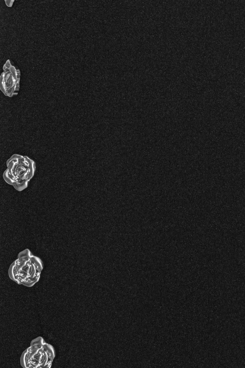 Crepe Button Dress Black features a streamlined silhouette with a concealed back zipper. The hemline falls to a mid-length and maintains a structured finish.