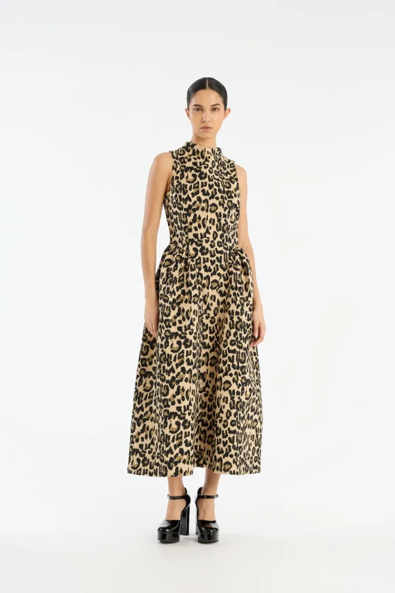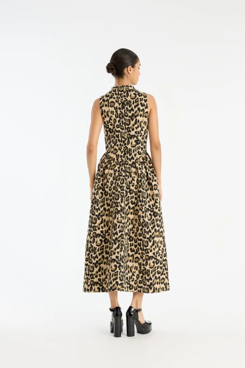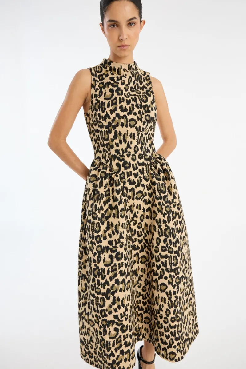 Jacquard Midi Dress Leopard Print is a sleeveless midi dress with a fitted bodice and a voluminous pleated skirt. It features a high neckline and a concealed zip fastening at the back. The dress is made from a jacquard-woven fabric with an all-over leopard print and is lined.