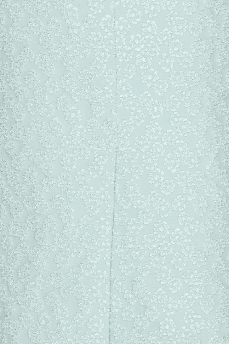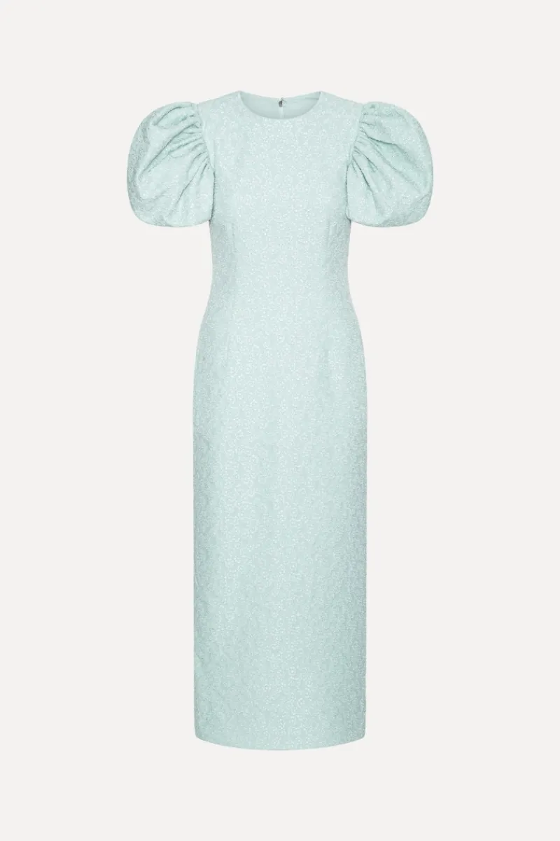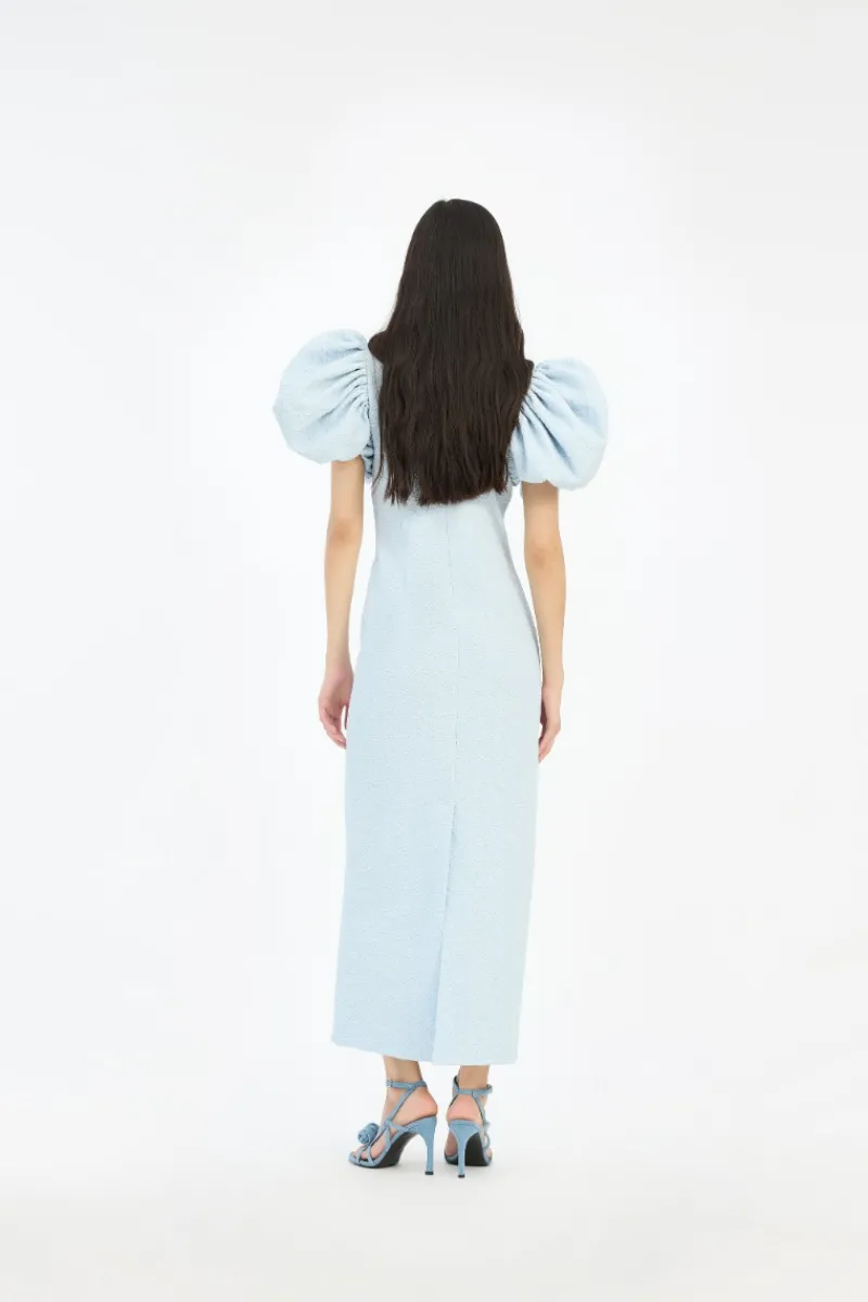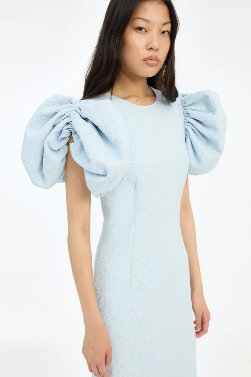 Jacquard Midi Puffy Dress Light Blue is a fitted midi dress with a round neckline and pronounced puff sleeves that create a sculptural silhouette. The dress features a streamlined fit through the body and a straight hem falling below the knee. It is crafted from textured jacquard with an all-over floral pattern.
