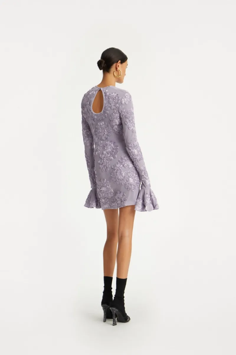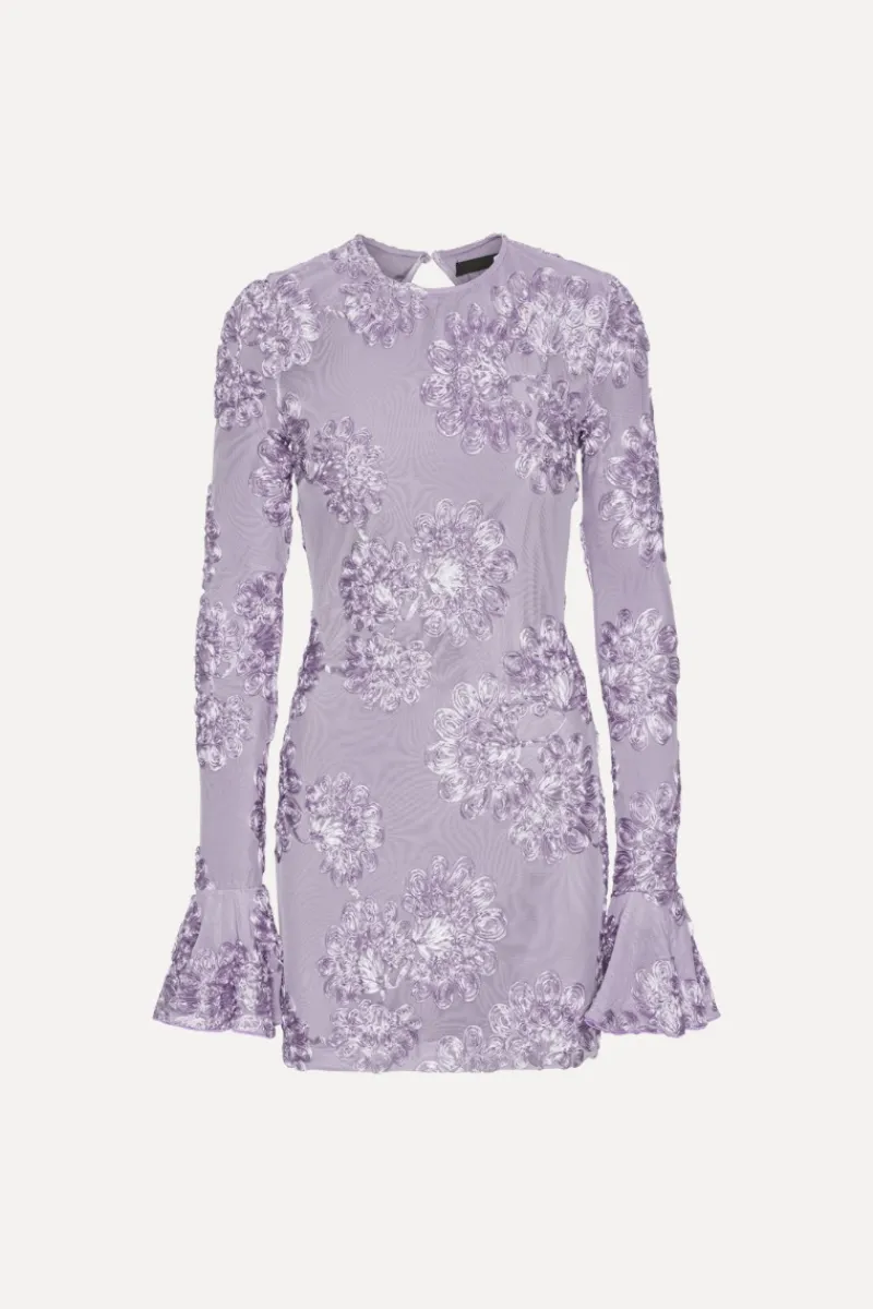 3D Mesh Mini Dress Purple features a round neckline and a fitted silhouette. The long sleeves have gathered shoulders and flared cuffs. The semi-sheer mesh base is decorated with raised floral appliqués throughout. A keyhole opening with a button closure at the back adds detail, while the mini-length hemline completes the design.
