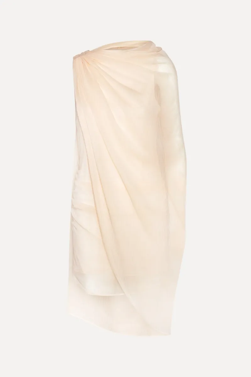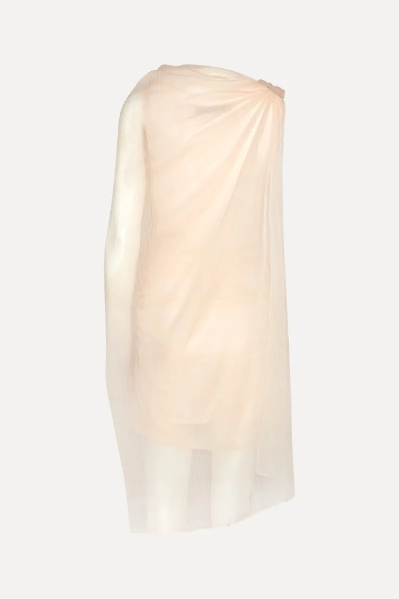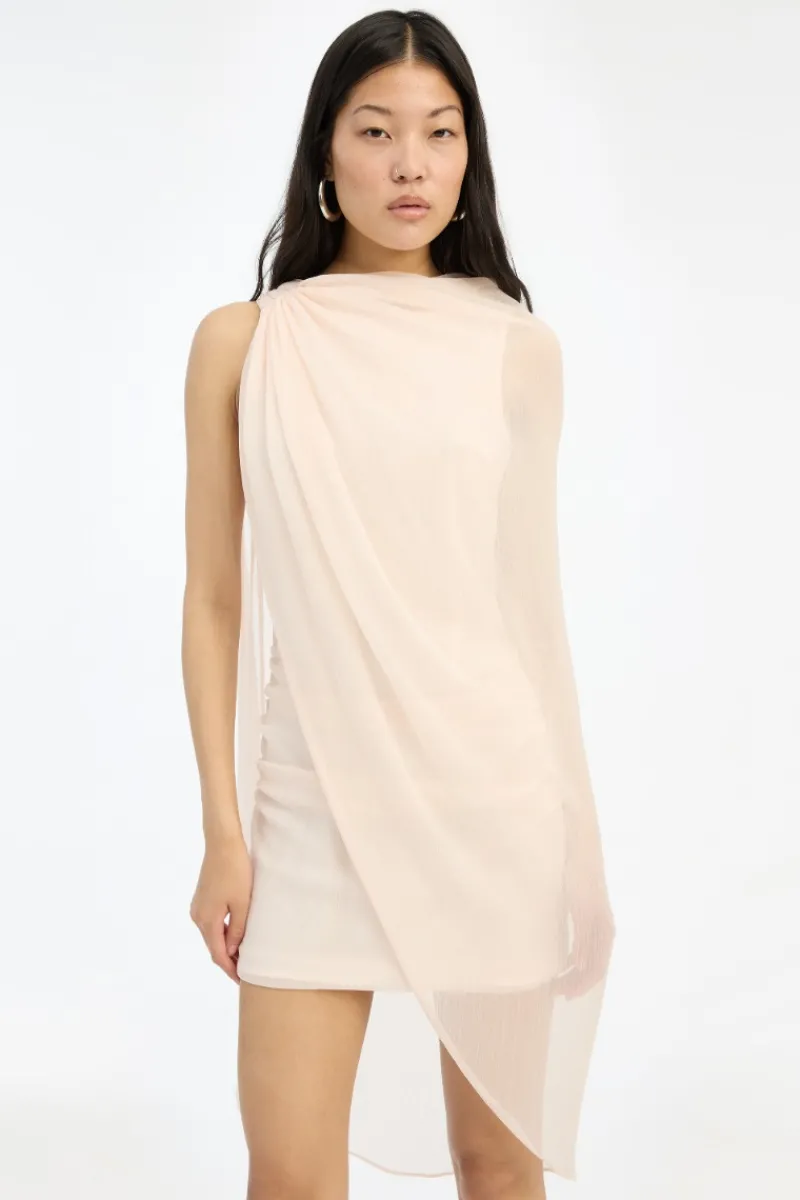 Chiffon Mini Cape Dress Light Pink is a mini dress crafted in lightweight chiffon with an asymmetric cape design. The dress features a draped upper section with soft folds and a semi-sheer outer layer that falls loosely around the body. It is lined and has a light, airy appearance with a clean and elegant silhouette.