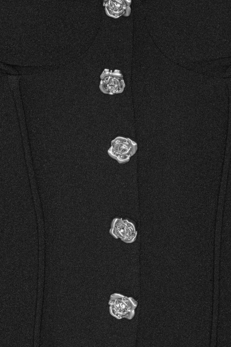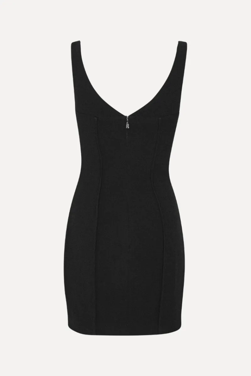 Crepe Off Shoulder Dress Black features a streamlined silhouette with a concealed back zipper. The hemline falls to a mini-length and maintains a structured finish.