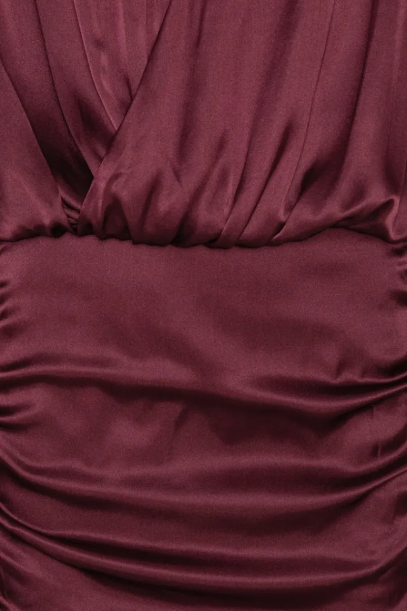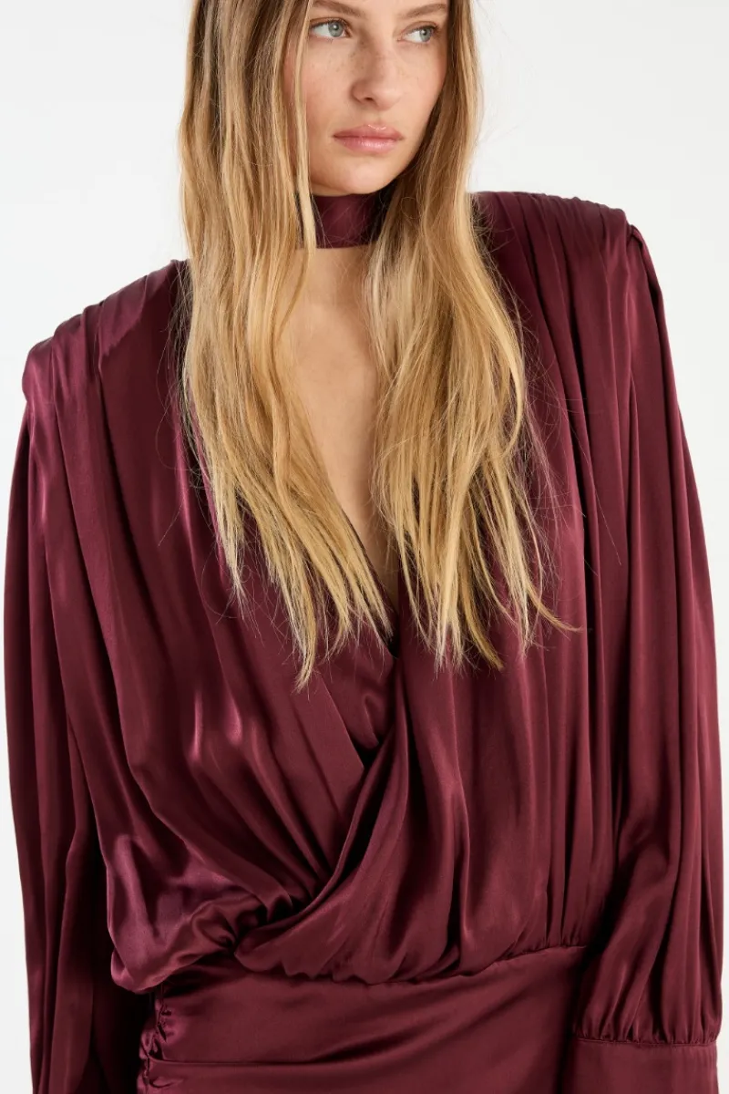 LS Silk V-neck Dress Burgundy features a deep V-neckline at both front and back. The bodice is softly draped with pleated shoulders and an attached scarf detail. Designed with long sleeves, a defined waist and a ruched mini skirt with an asymmetrical hemline. Hidden zip closure at the back.
