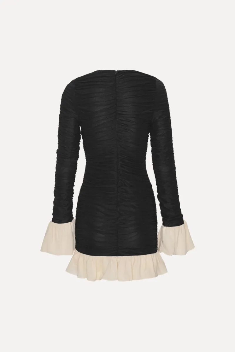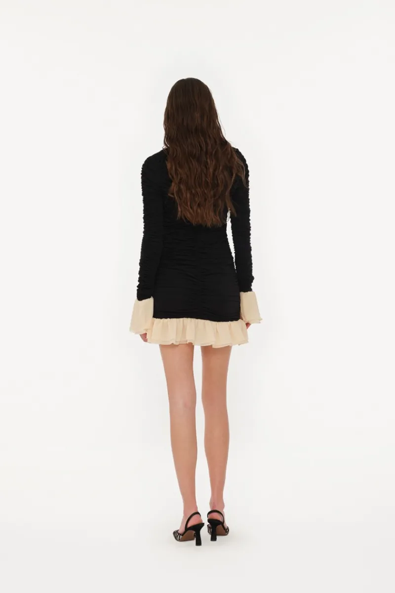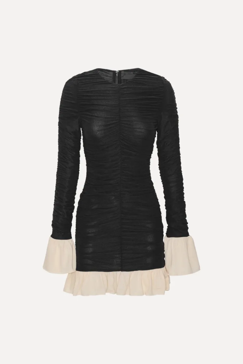 The Mini Ruched LS Dress features long sleeves with contrasting flared cuffs. It has a round neckline and a short length. The dress is designed with ruched details throughout the body, both front and back, adding texture to the fabric. A hidden zipper is placed at the back for closure, and the hem is finished with a contrasting ruffle trim.