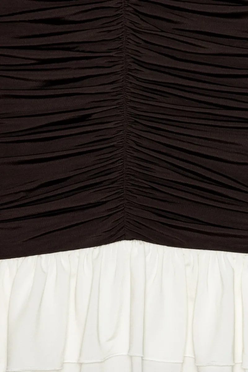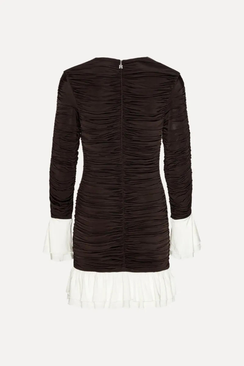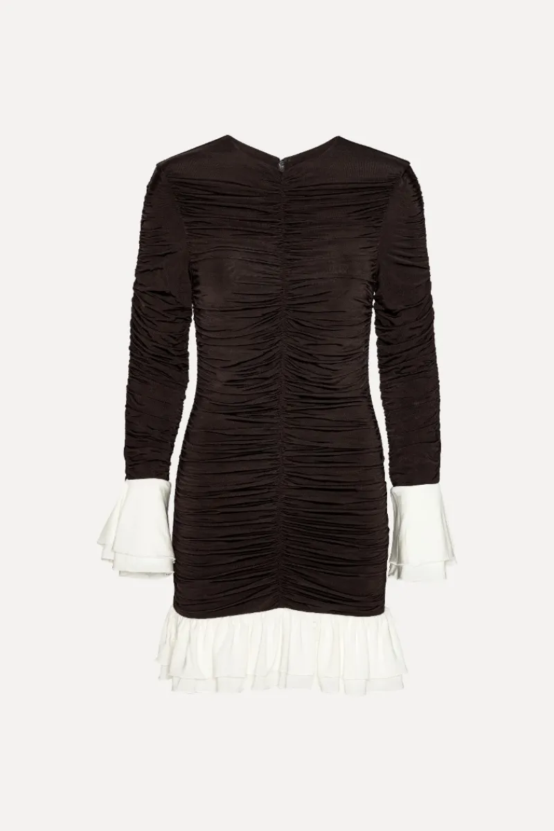 Mini Ruched Ls Dress Dark Brown is a long-sleeved mini dress with an all-over ruched texture and a fitted silhouette. It features a round neckline, a tonal back zip closure, and layered contrast flounces at the sleeve cuffs and hem. The dress is lined. Made from a soft stretch viscose blend (Preferred).