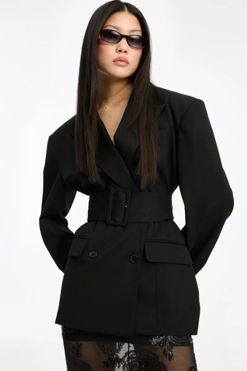 Belted Blazer Black is a double-breasted blazer. The design features sharp shoulders and a wide belt that accentuates the waist. The blazer has front flap pockets and buttoned cuffs. The blazer is lined.