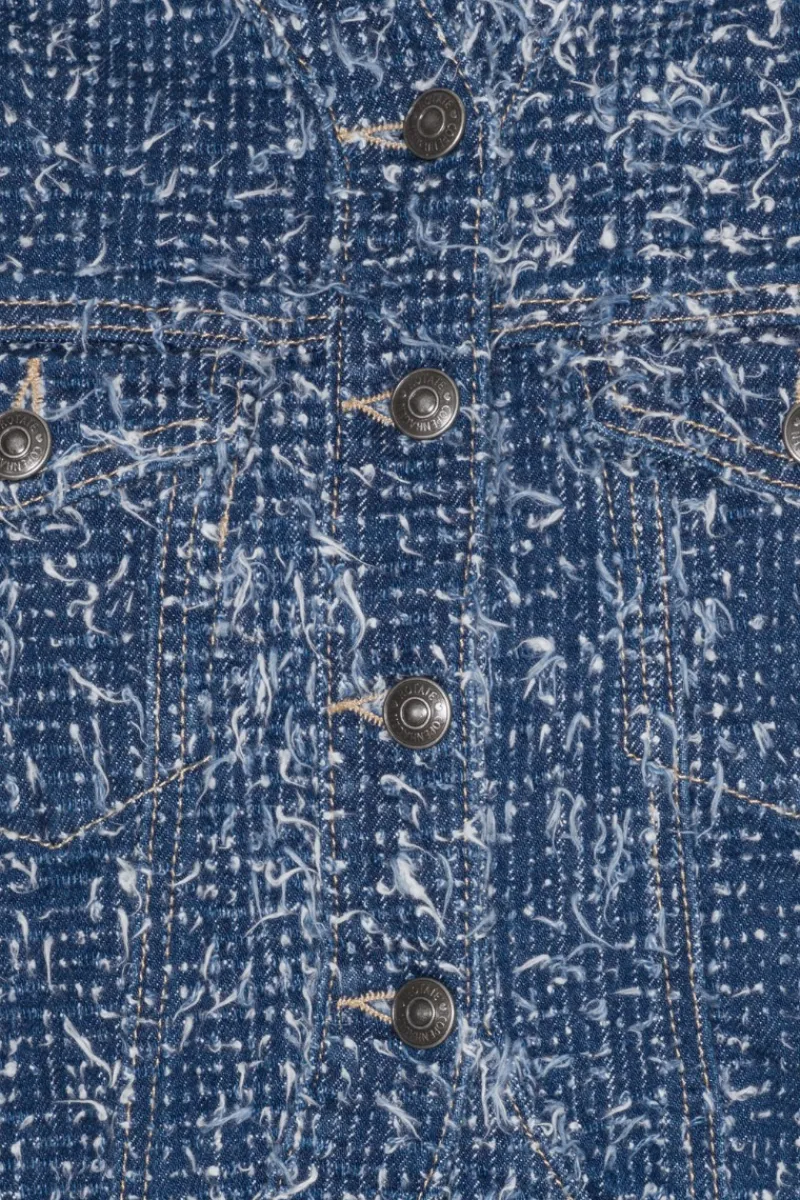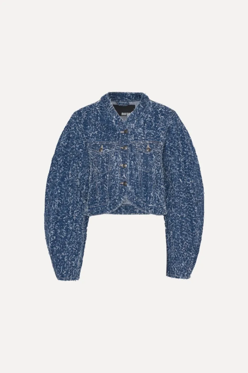 Round Sleeve Denim Jacket Blue features a slightly cropped silhouette with a pointed collar and front button closure. The voluminous sleeves taper at the cuffs, adding structure. Two buttoned chest pockets and contrast stitching detail the front. The curved hemline enhances the shape. Designed to pair with the Denim Loose Fit Pants Blue for a coordinated look.