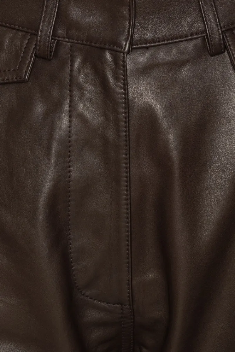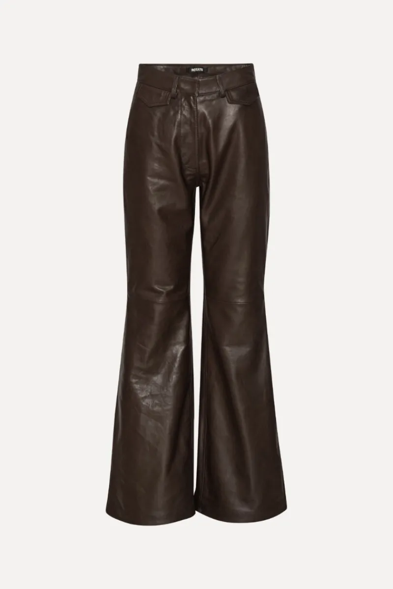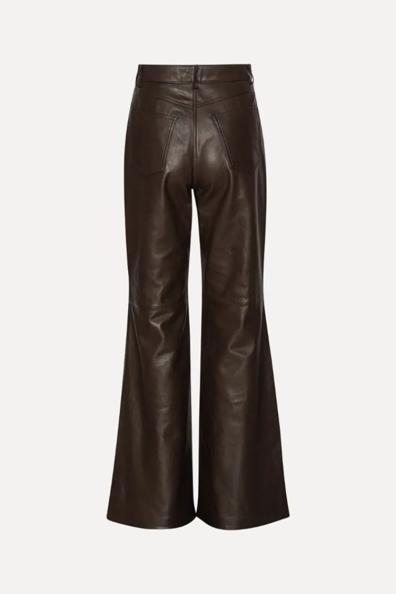 Flared Leather Pants Dark Brown are crafted from smooth lamb leather and designed with a high waist and flared legs. The style features front and back pockets, belt loops, and a concealed front zip with button closure.