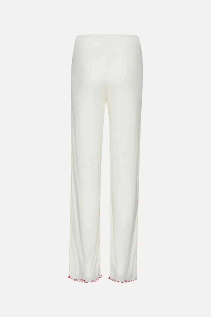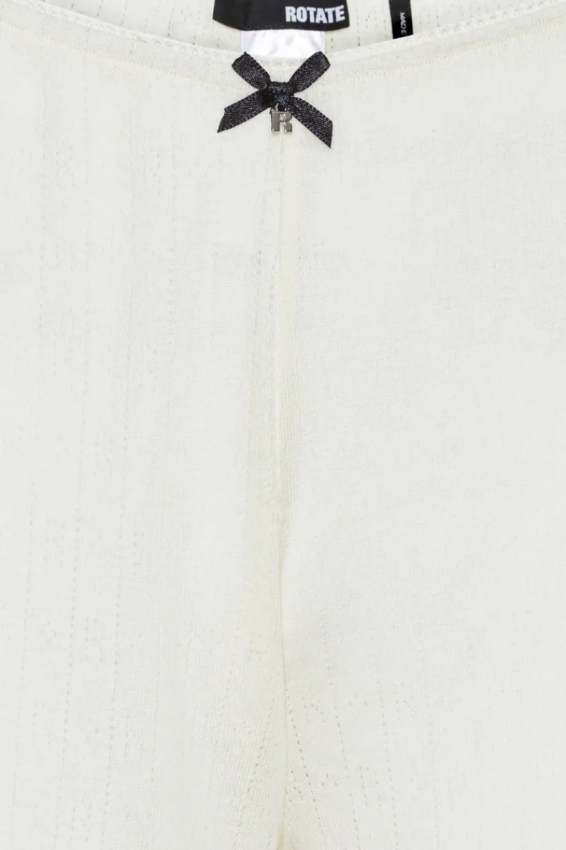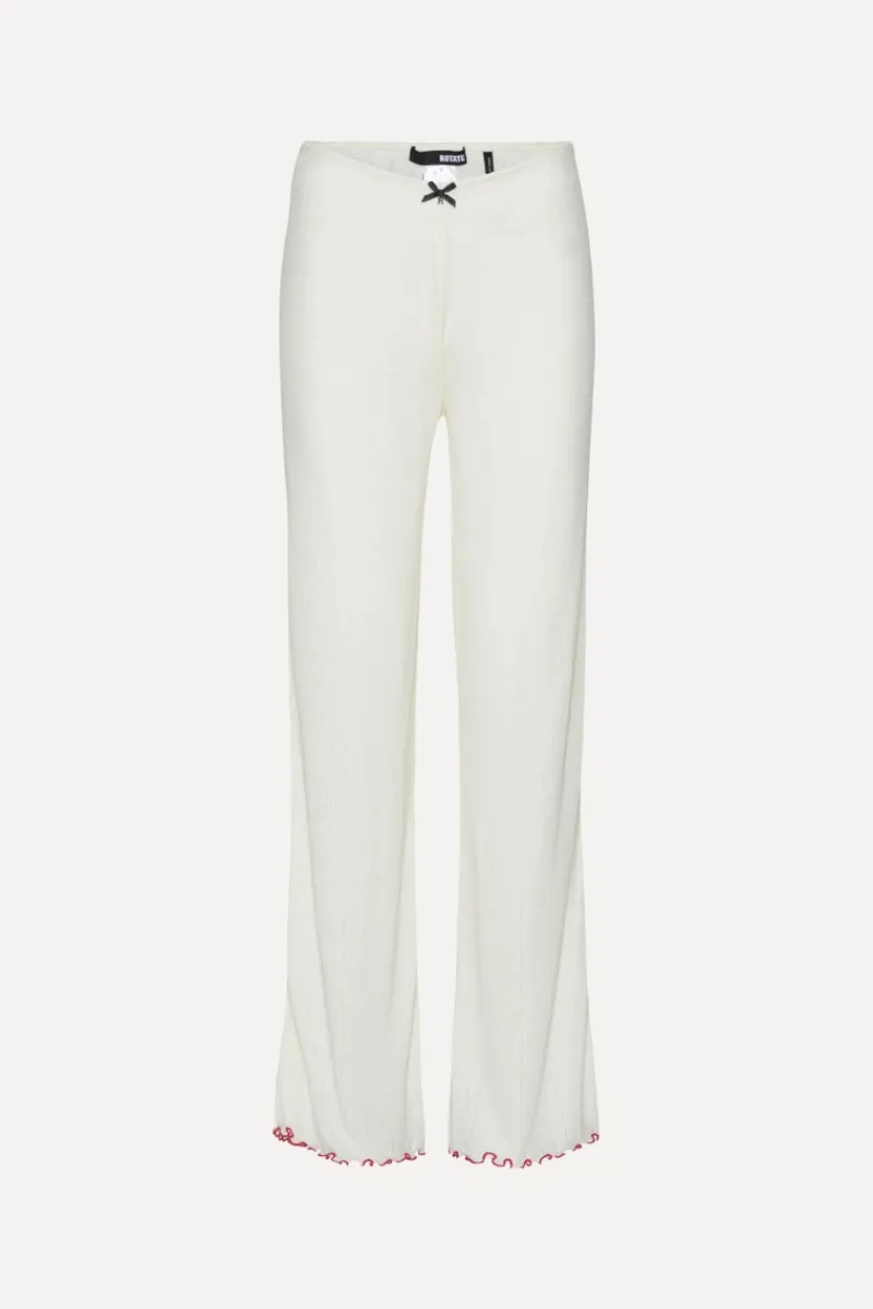 Pointelle Low Leggings White feature a lightweight pointelle knit design with a soft elastic waistband for a comfortable fit. These full-length leggings are detailed with a delicate bow at the front and ruffled hems for a subtle feminine touch. Pair them with the matching Pointelle Longsleeve Top for a coordinated look.