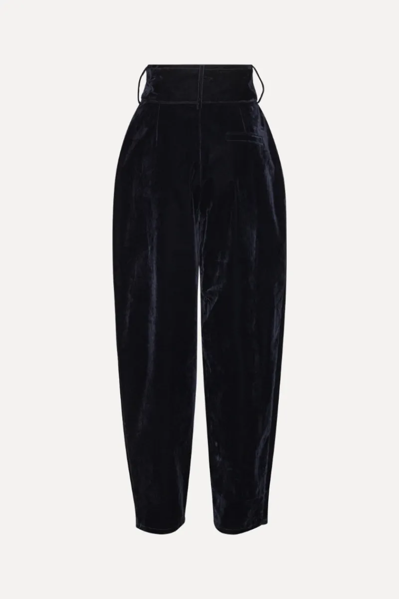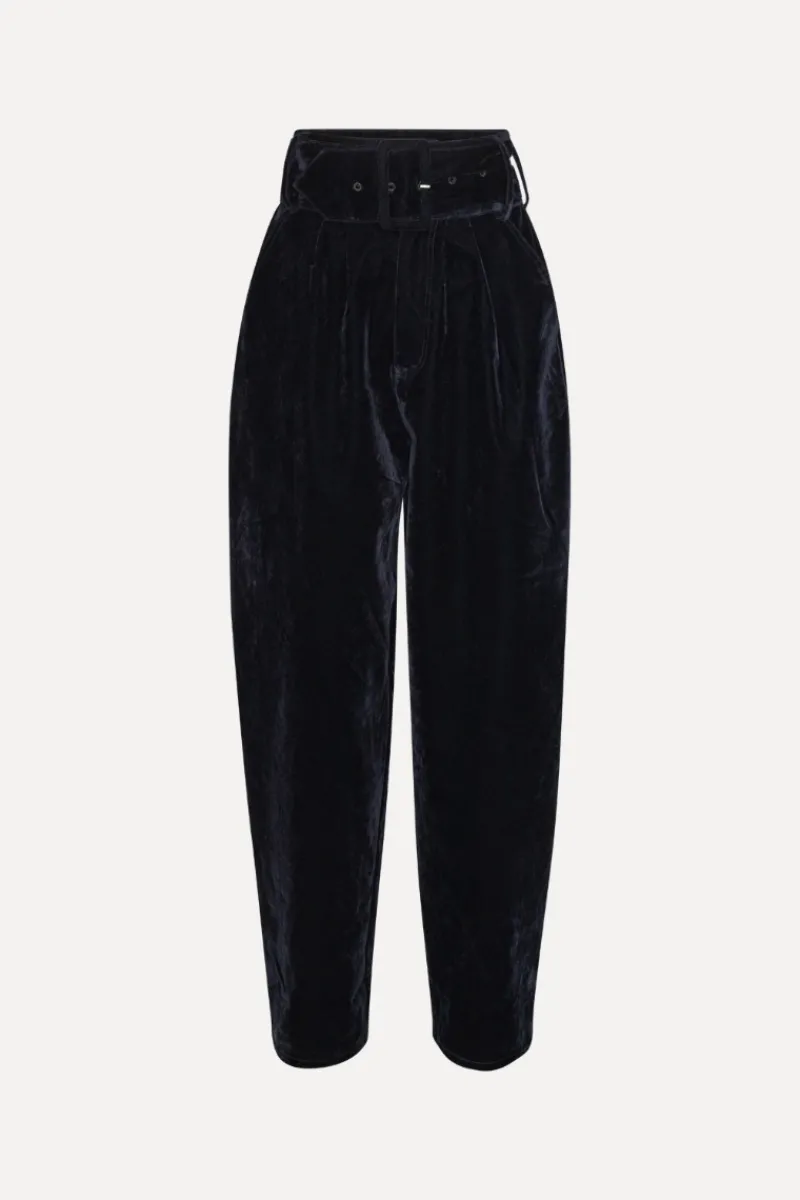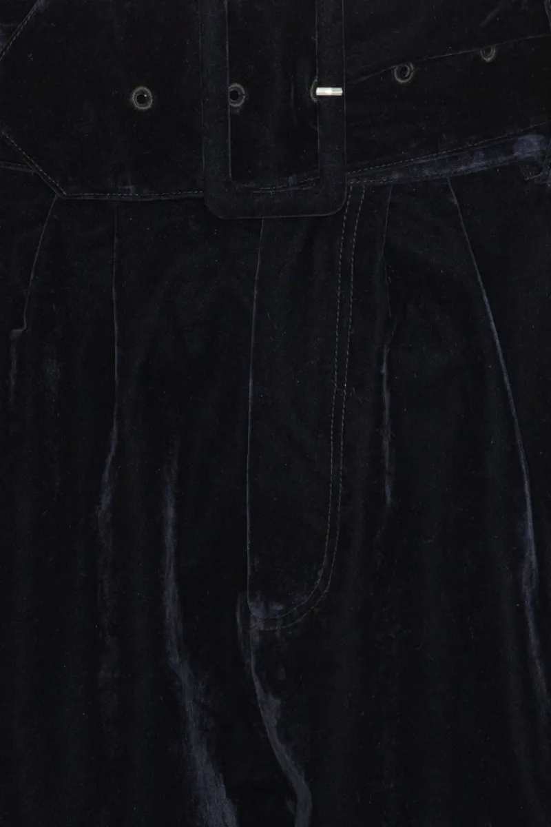 Velvet Carrot Pants Dark Blue are made from soft velvet with a sculpted high waist and loose carrot-shaped legs. The design features side pockets, a single back pocket, and a wide matching belt with a square buckle.
