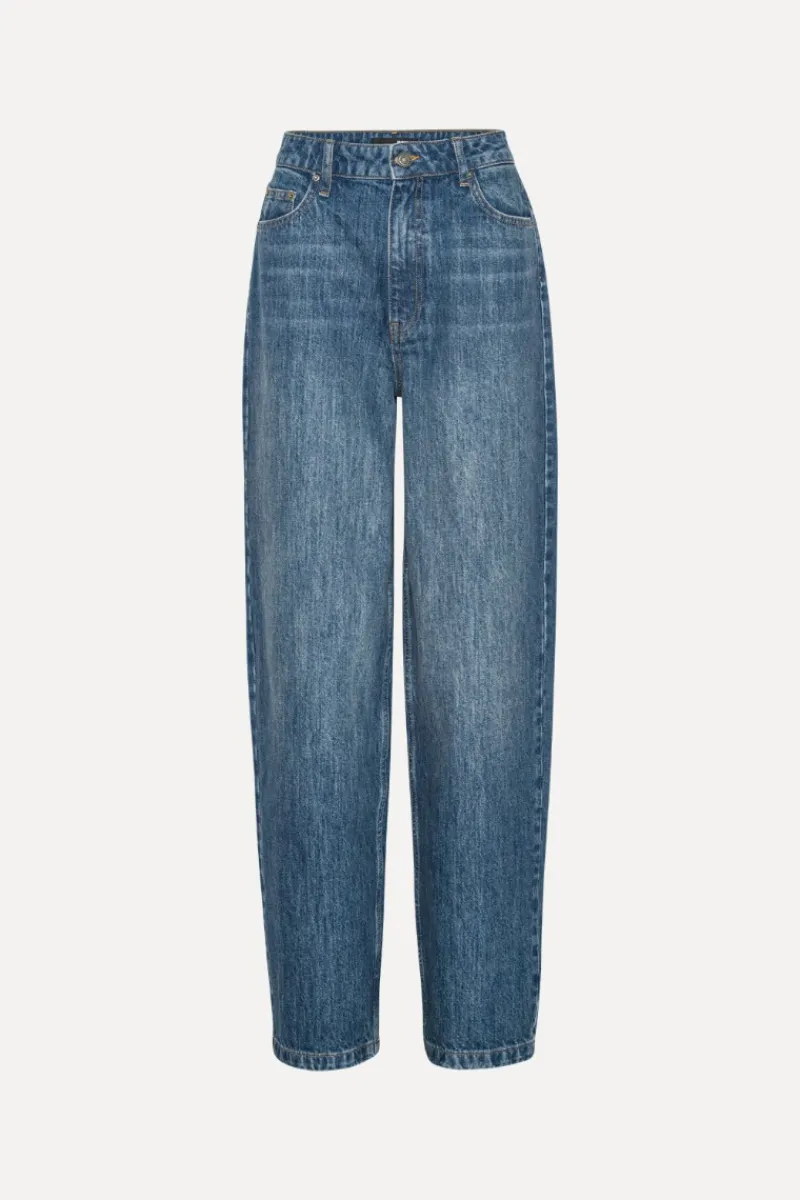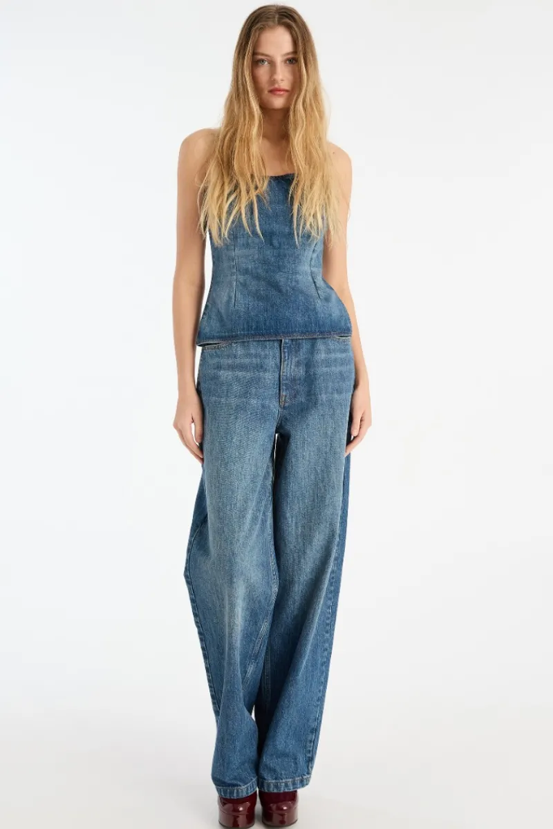 Wide Leg 5 Pocket Pants Blue are designed in medium blue denim with a vintage wash effect. The silhouette is full-length with a high waist and wide legs. Classic five-pocket construction and visible stitching complete the look.