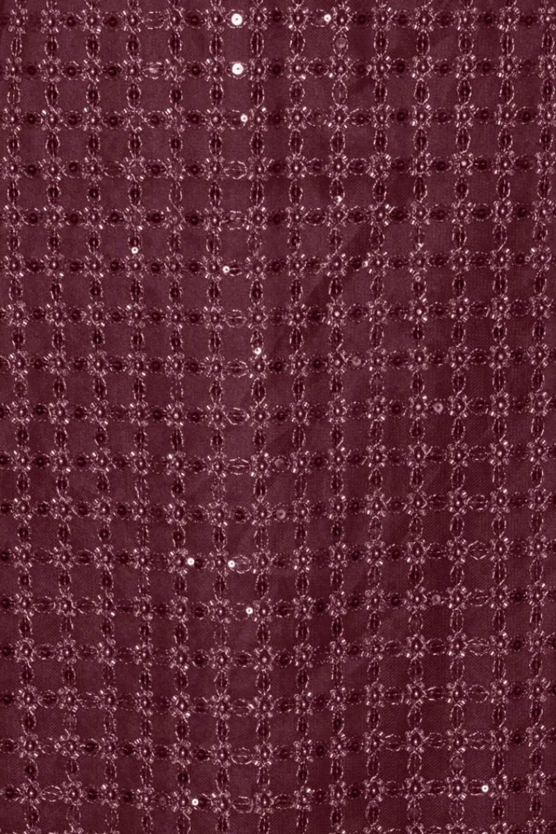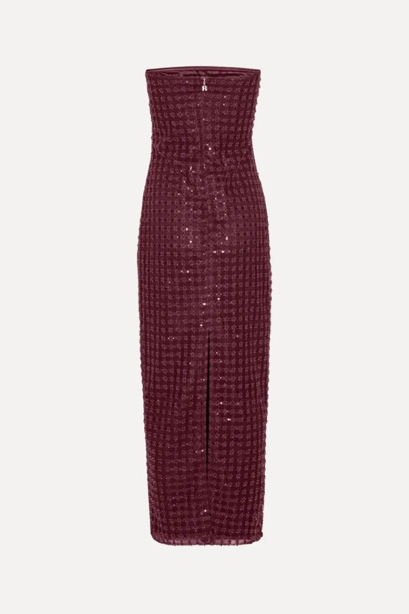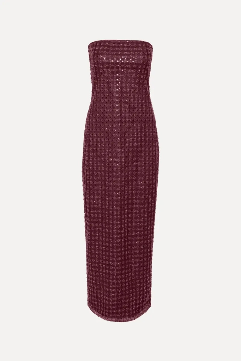 Beaded Maxi Tube Dress Bordeaux has a strapless design with a fitted silhouette and a straight neckline. The fabric features an all-over beaded pattern. A concealed zipper at the back ensures a clean finish. The skirt falls to a maxi length with a back slit for ease of movement.