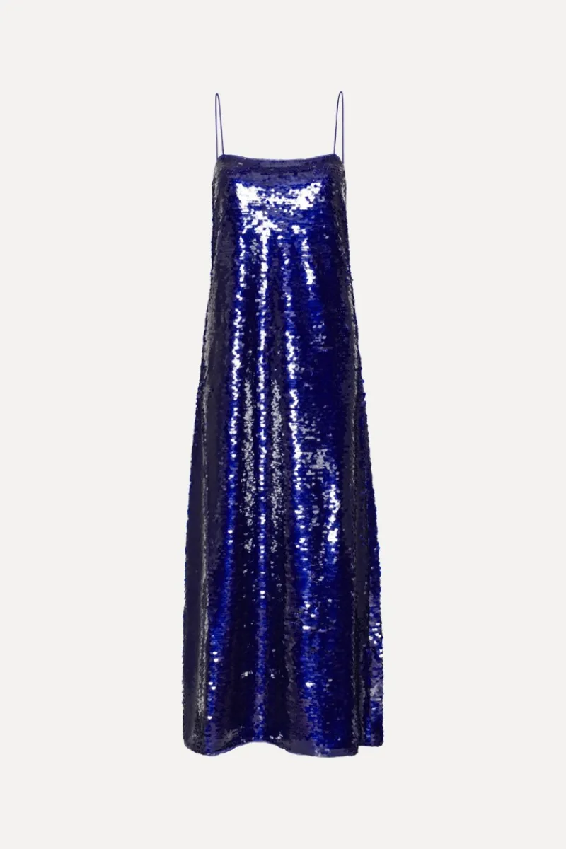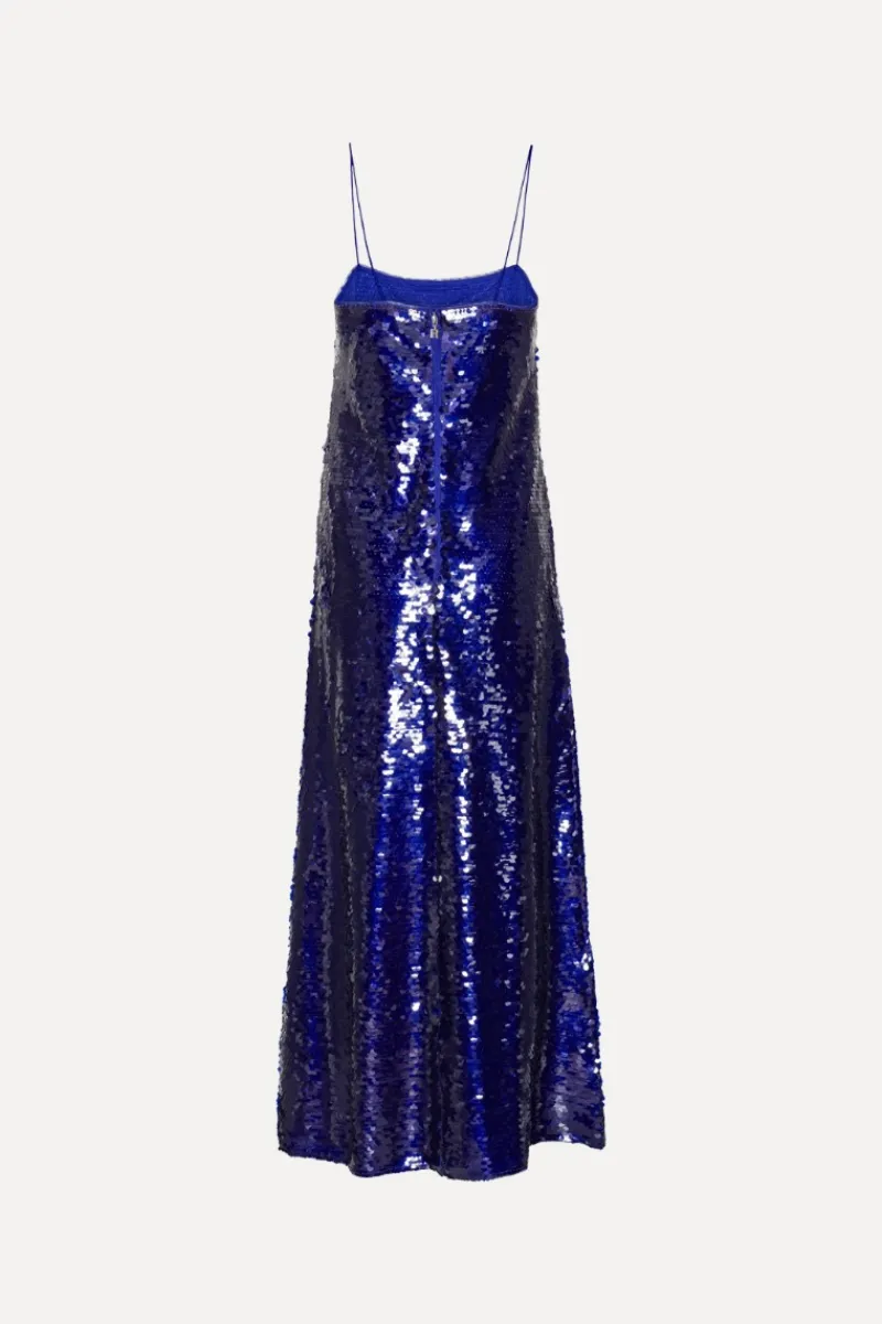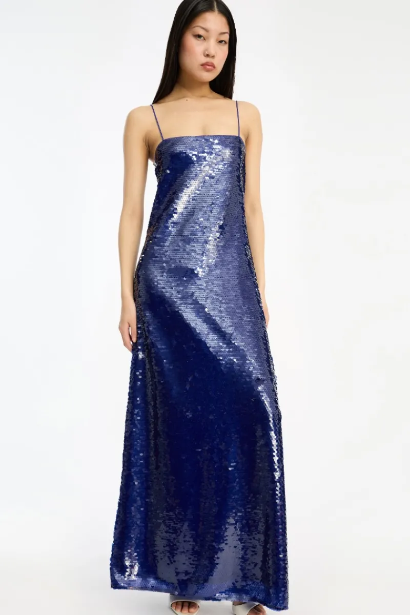 Sequins Maxi Dress Dark Blue is a floor-length dress with thin shoulder straps and a square neckline. The dress features an all-over sequin surface and a straight silhouette
