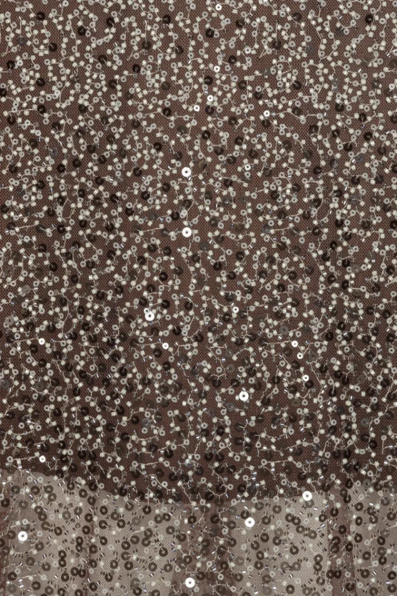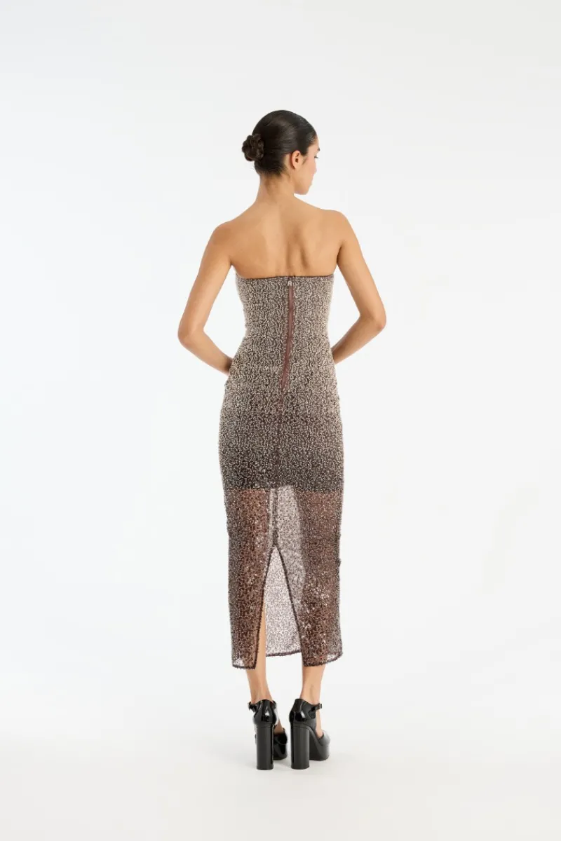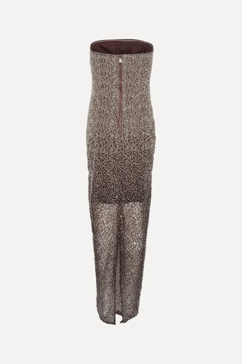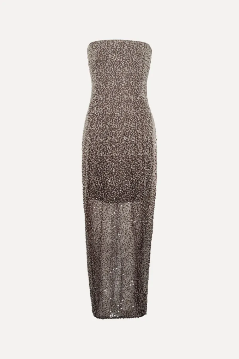 Beaded Midi Tube Dress Brown is a strapless, fitted midi-length dress fully embellished with shimmering sequins.