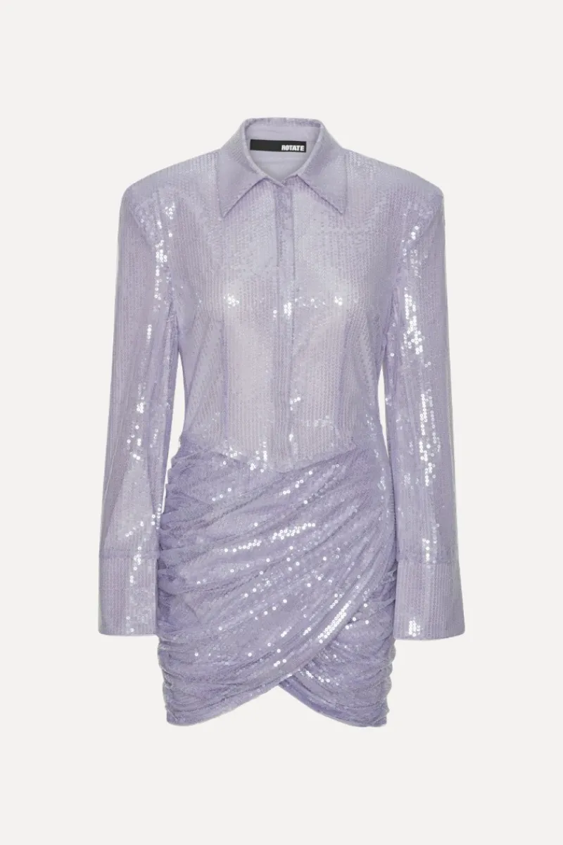 Sequin Mini Dress Light Purple features a structured silhouette with a pointed collar and concealed button placket. The long sleeves are finished with wide cuffs. The draped skirt section wraps at the front, creating an asymmetric hemline. The ruched detailing enhances the fit, while a concealed back zipper ensures a seamless closure.
