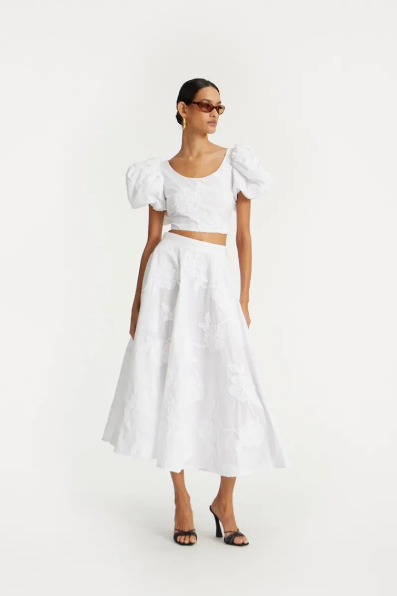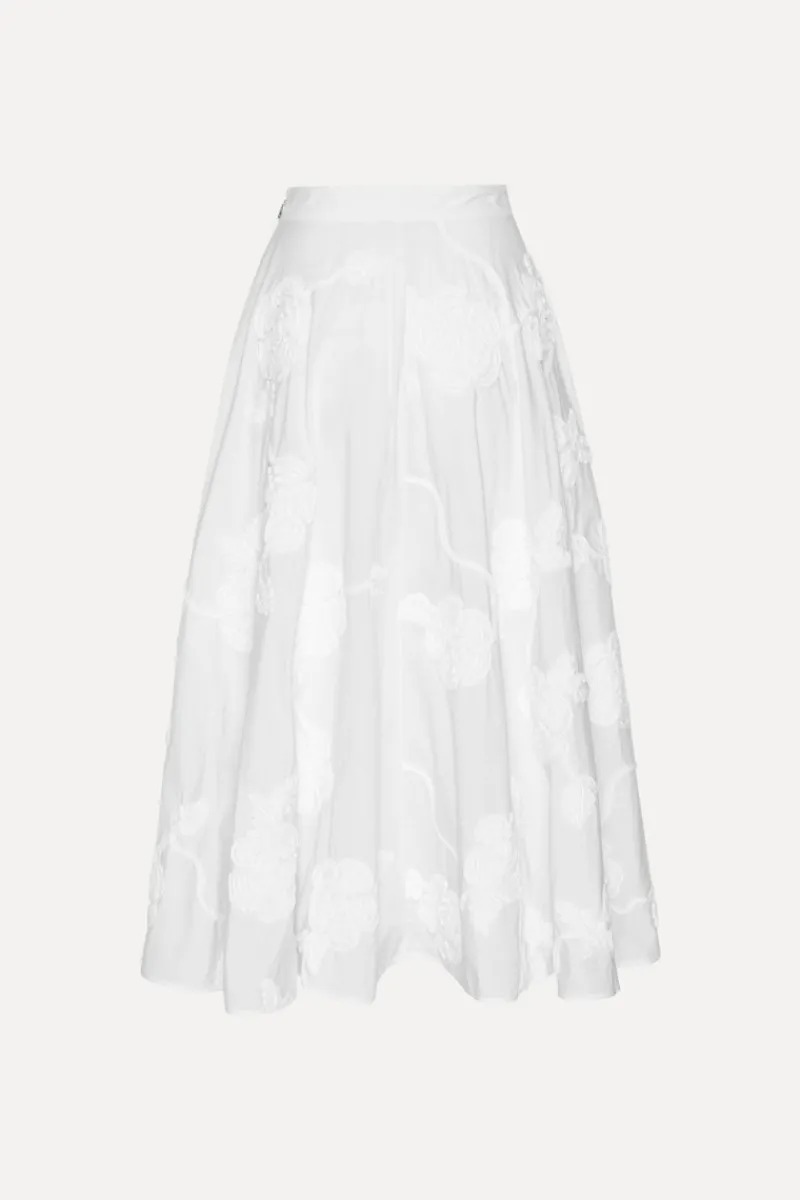 Flower Maxi Skirt Bright White is a high-waisted skirt with a voluminous, flared silhouette. It features an all-over tonal floral embroidery and is softly gathered at the waistband. The skirt is finished with a concealed side zipper.