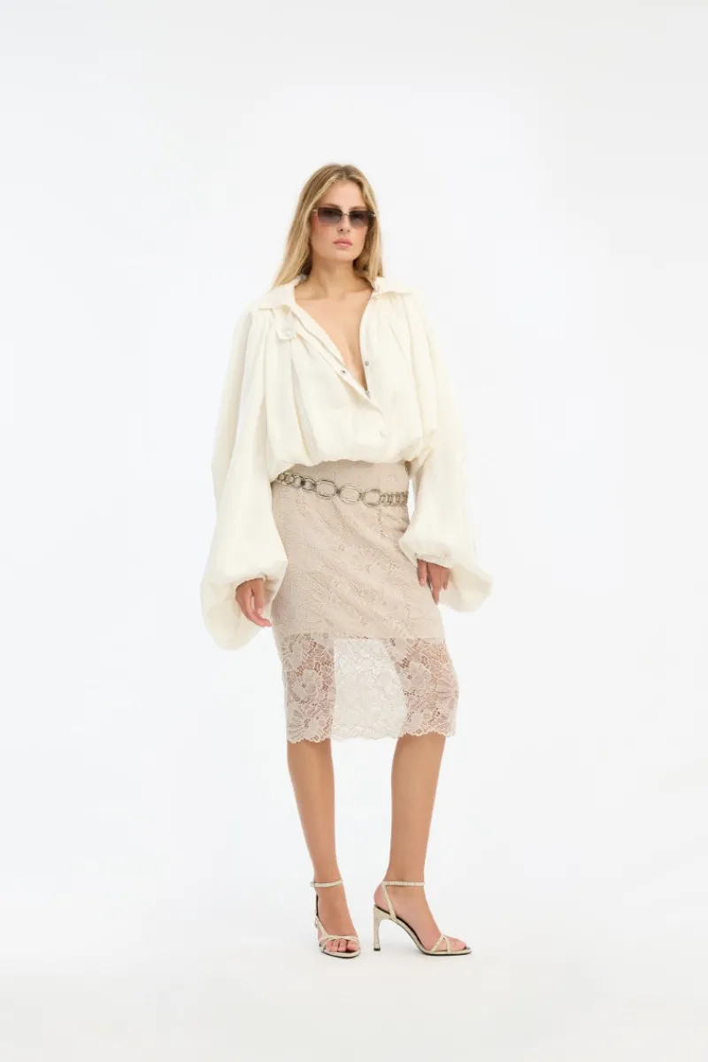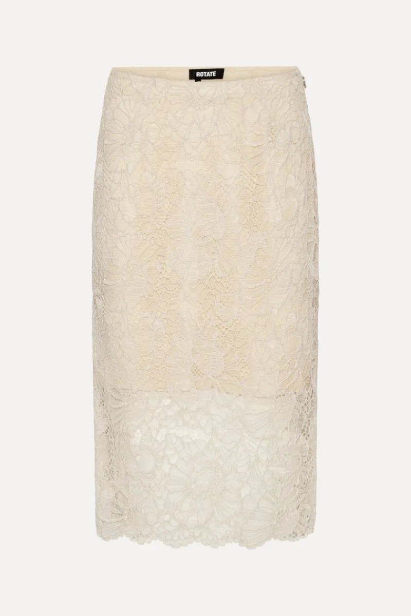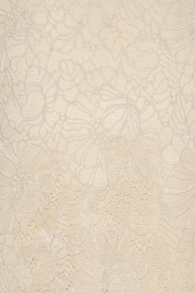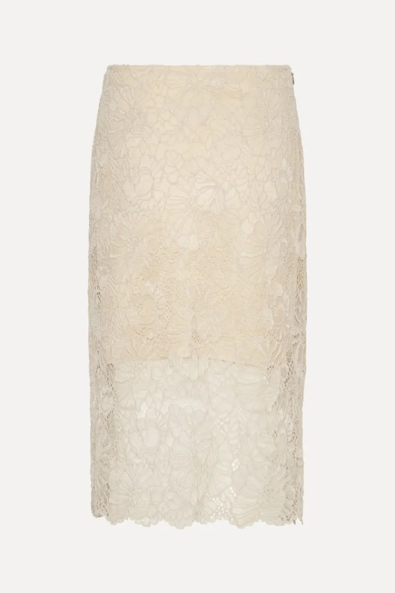Lace Midi Pencil Skirt Cream is a midi-length skirt with a fitted pencil silhouette. The skirt is crafted in lace with an all-over floral-inspired pattern and features a straight shape. It has a smooth waistband and a side zipper closure. The skirt is lined.