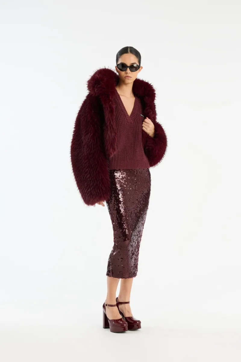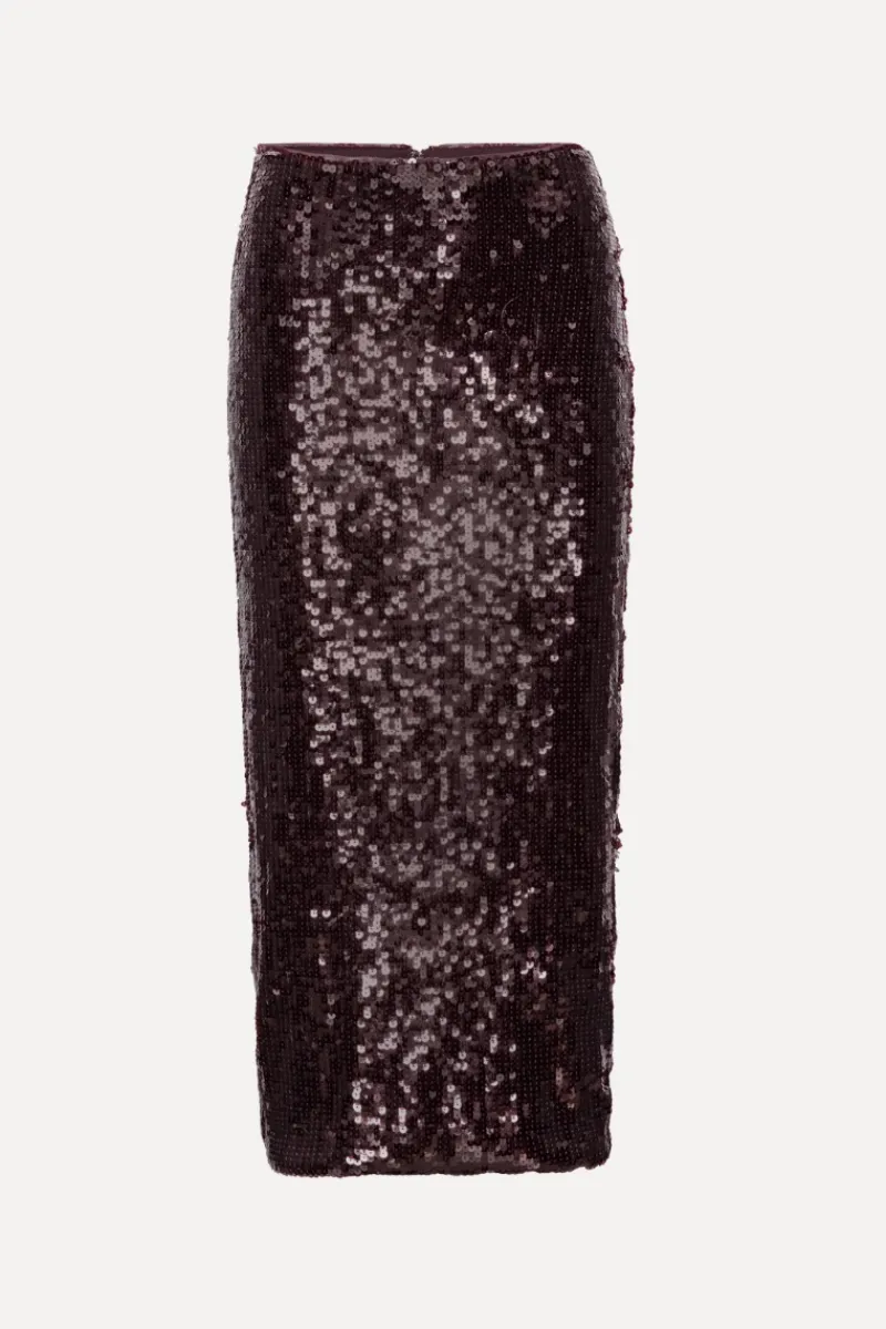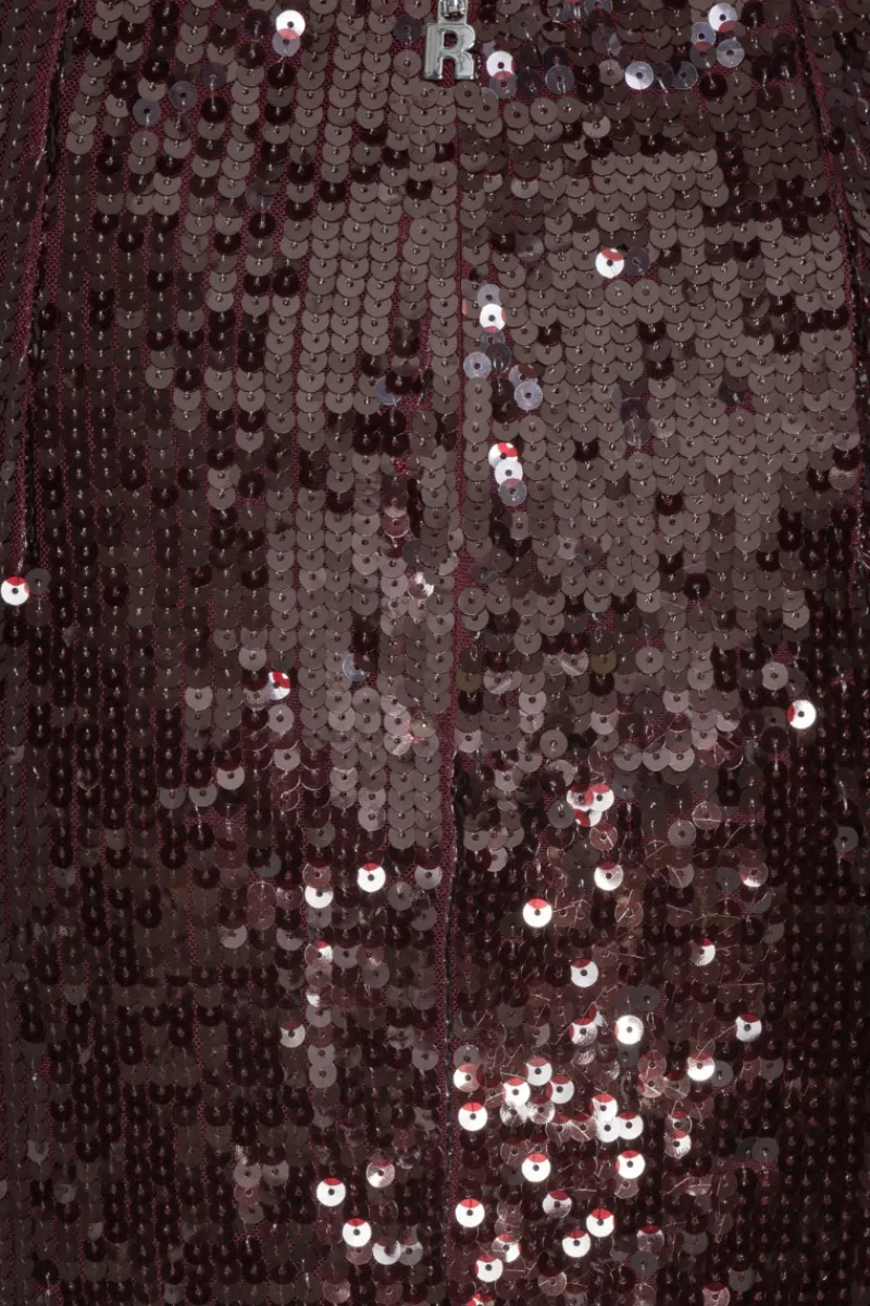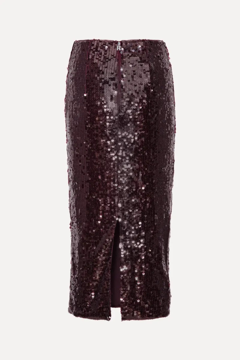 Sequins Pencil Skirt Burgundy is designed with a fitted silhouette and midi length. The skirt is fully covered in shimmering sequins and features a back slit and zip closure.