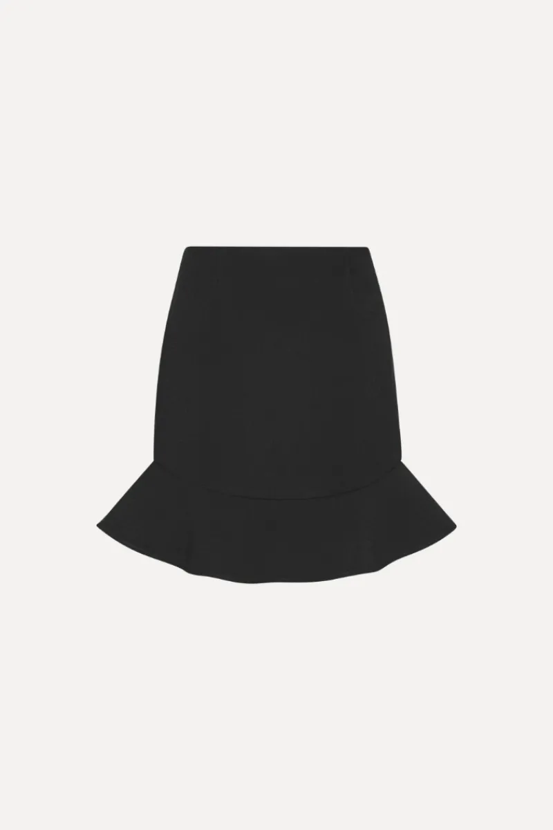 Suiting Mini Ruffle Skirt Black is a structured mini skirt with a fitted waist and a flared ruffle hem. It can be paired with the Suiting Fitted Shirt Black for a coordinated look.
