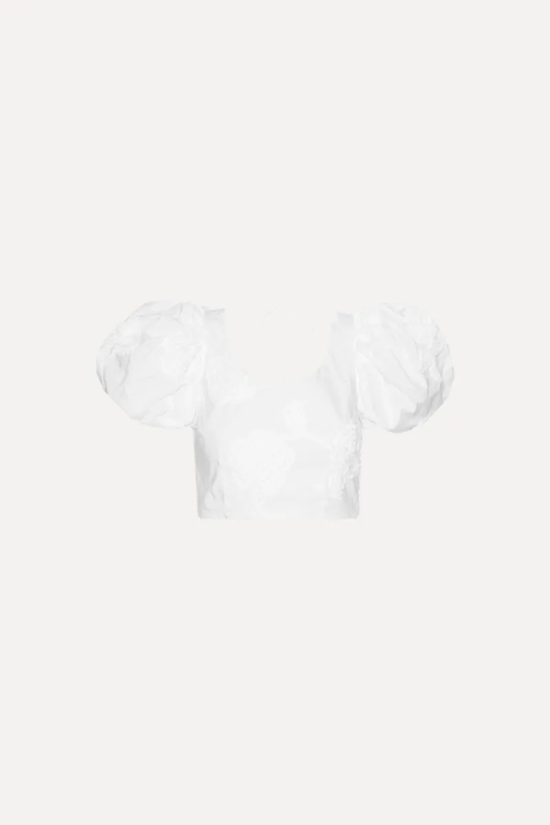 Puff Sleeve Cotton Top White features a round neckline and a relaxed fit through the body. The short sleeves drape softly, while the front includes decorative detailing. A back closure ensures a secure fit.