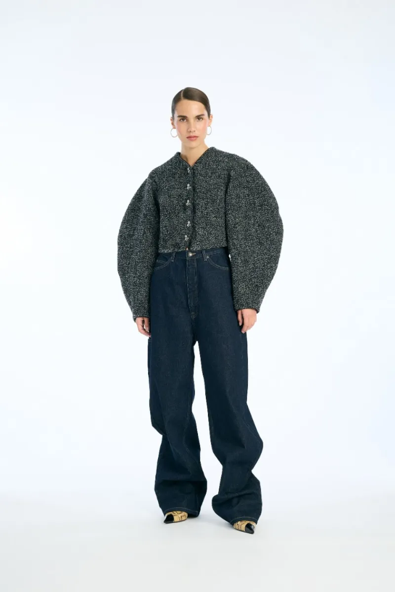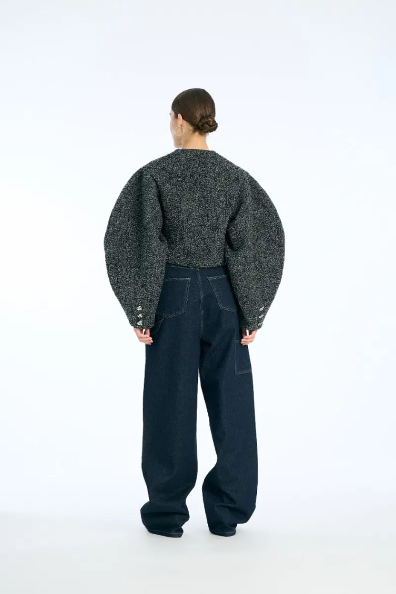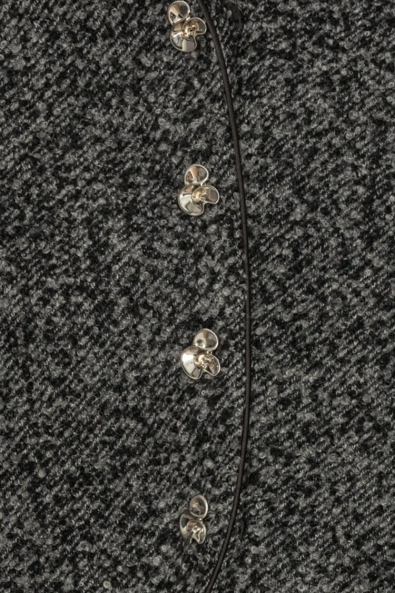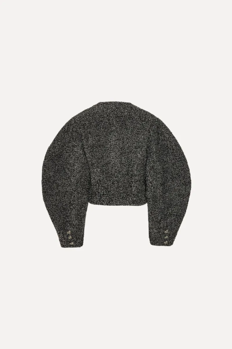 Boucle Short Jacket Dark Grey is crafted from a textured wool blend with a cropped silhouette. The jacket features voluminous long sleeves and a round neckline. It is detailed with decorative metallic flower-shaped buttons along the front and smaller matching buttons at the cuffs. The jacket is lined for comfort. Can be matched with Boucle Mini Skirt Dark Grey for a coordinated look.