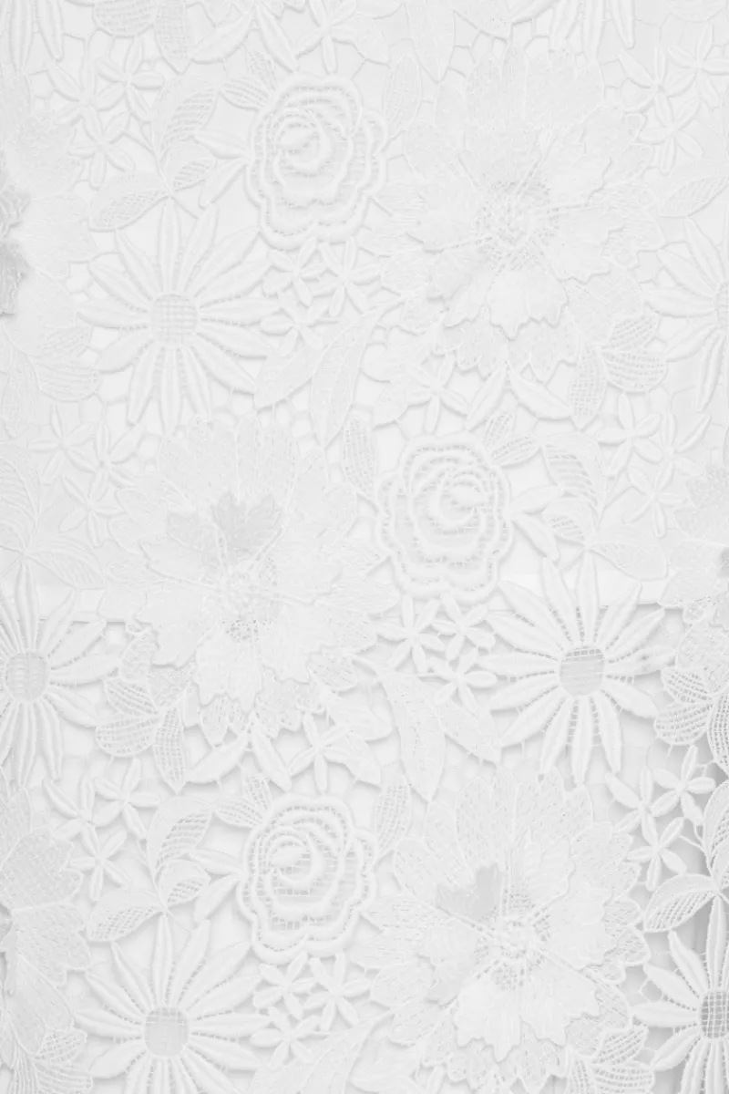 The 3D Lace Pencil Skirt White features a refined pencil silhouette with a back slit for effortless movement. The intricate lace pattern is elevated with dimensional details that add texture and sophistication. A concealed back zipper completes the elegant design.