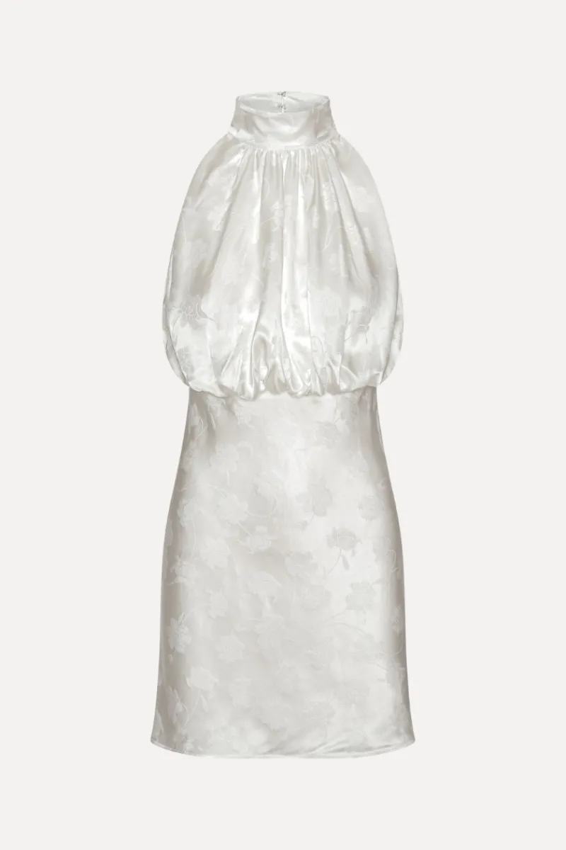 Sleeveless Dress White is a sleeveless dress with a high neckline and a voluminous gathered upper body. The design features a softly ballooned top that falls into a more fitted skirt, creating a defined silhouette. The surface is finished with a subtle woven floral pattern with a light sheen, and the dress is closed with a zip fastening at the back.
