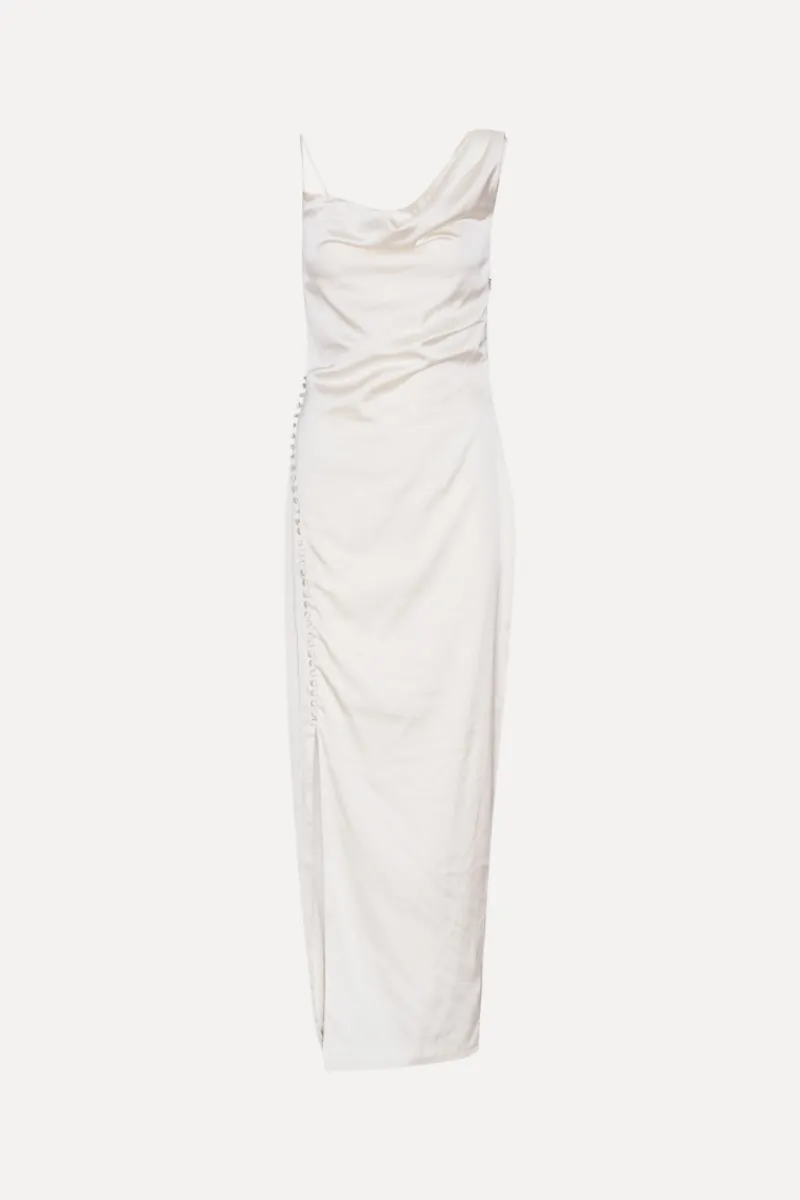 The Satin Draped Dress White features an asymmetrical strap design with one thin and one wide strap. The draped silhouette is enhanced by side buttons extending from the waist to a slit. A concealed side zipper ensures a smooth fit and refined finish.