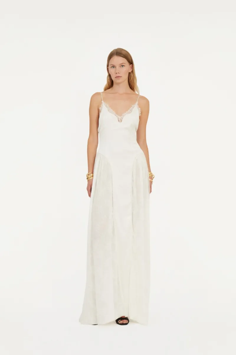 The Satin Lace Maxi Dress White features a V-neckline with thin straps and a fitted waist for a flattering silhouette. Delicate lace trims accentuate the design, while larger lace panels on both sides create a sophisticated contrast with the satin fabric.