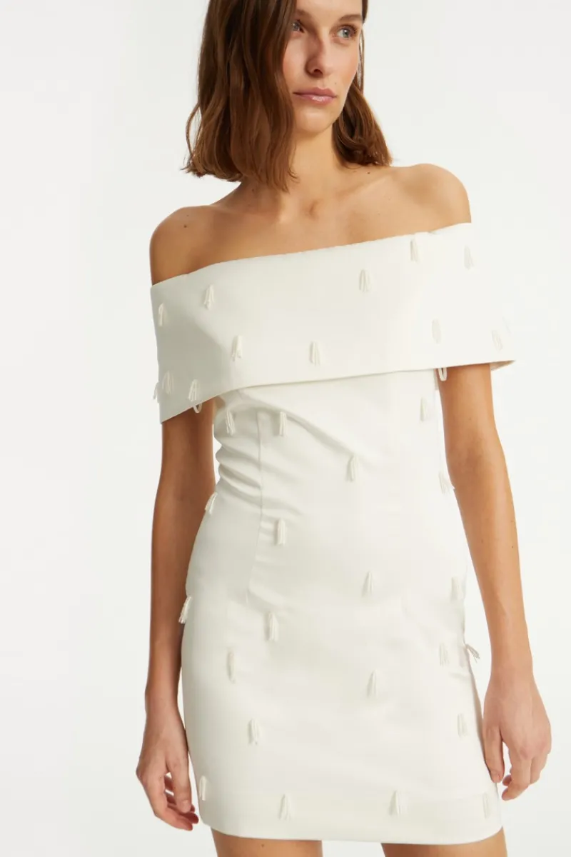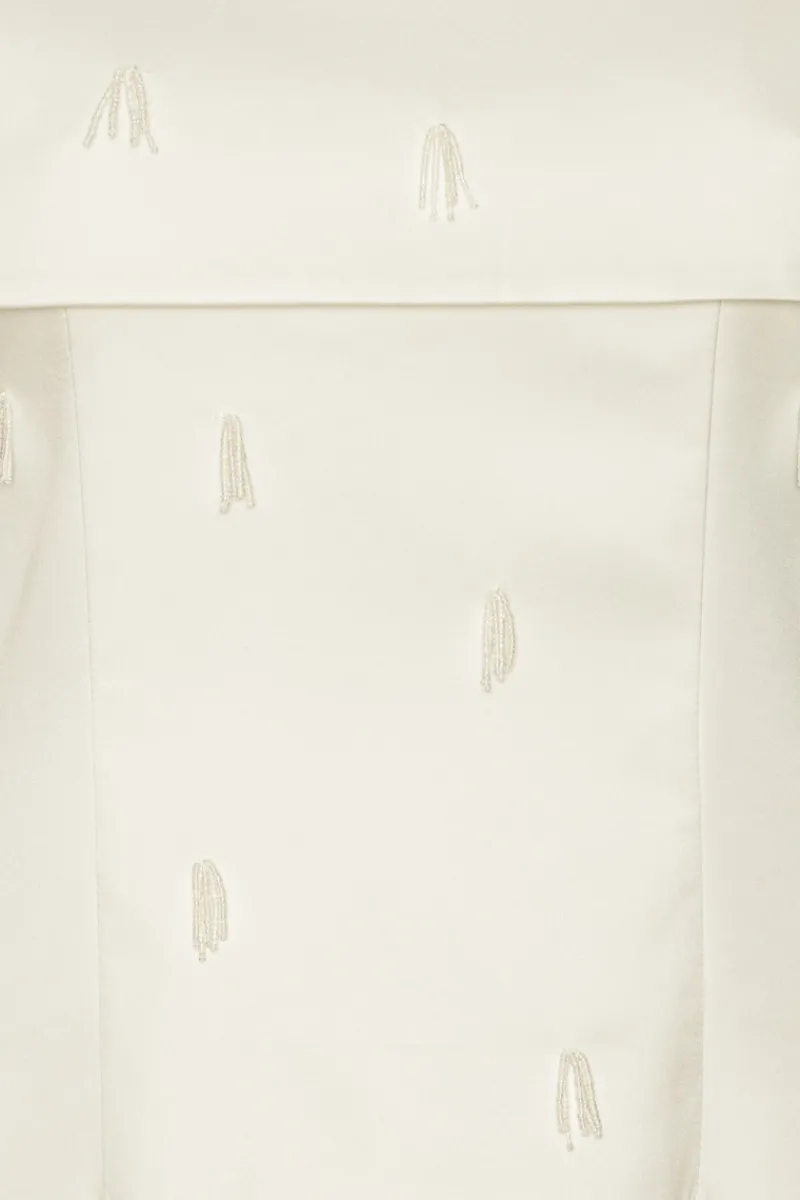 The Beaded Satin Mini Dress is cut from smooth satin and embellished with tonal beading. It features slim straps, a sculpted bust, and a fitted shape that flares gently to a mini hem.