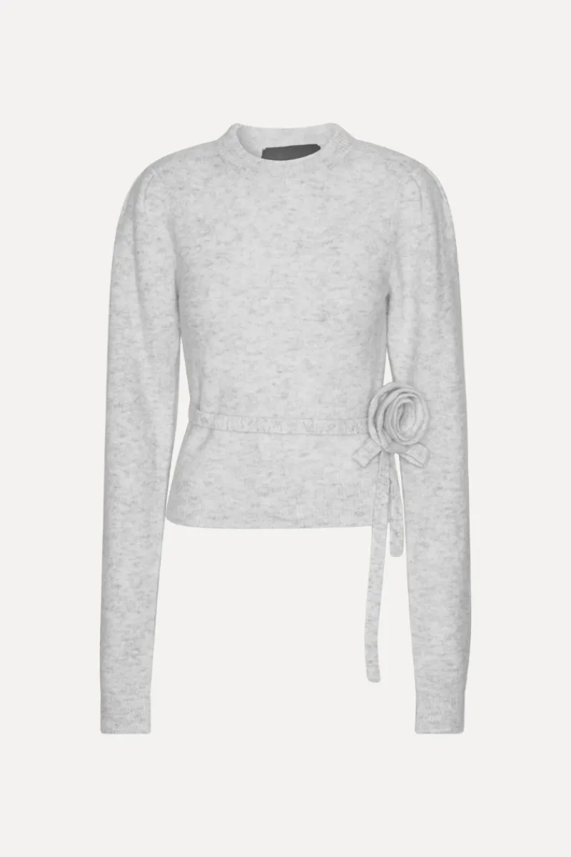 Knit Puff Crewneck Light Grey features a classic crew neckline and long sleeves with subtle puff details at the shoulders. The fitted waist is accentuated by a thin knit belt with a decorative rosette on the side. Ribbed cuffs and hem add structure, while the soft knit fabric ensures a comfortable feel.