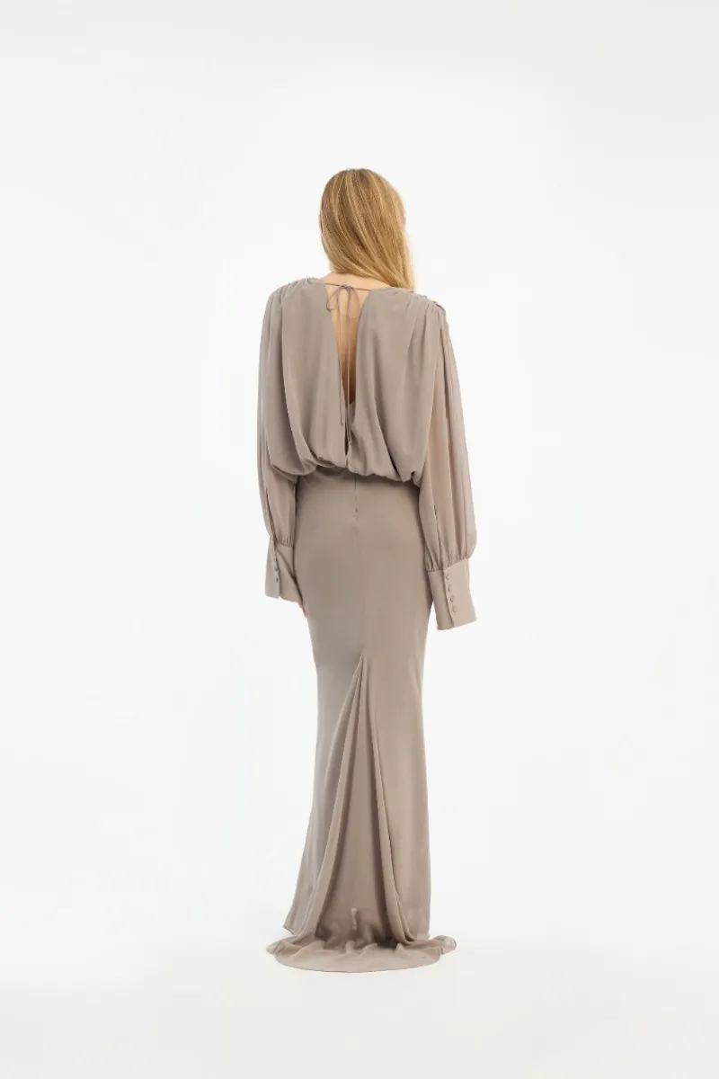 Chiffon Ls Maxi Dress Taupe is designed in a soft taupe tone with a long, elegant silhouette. The dress features a deep V-neckline with a wrap-style front and long, flowing sleeves finished with wide cuffs. The upper body has softly draped chiffon detailing, while the skirt falls straight and fluid to a maxi length. A long tie detail at the neckline extends down the front, adding movement and a refined finish. Crepe de Chine is a lightweight, smooth satin-like fabric with a soft drape, subtle matte texture, and gentle crinkled finish that feels fluid and elegant against the skin. The dress is lined.