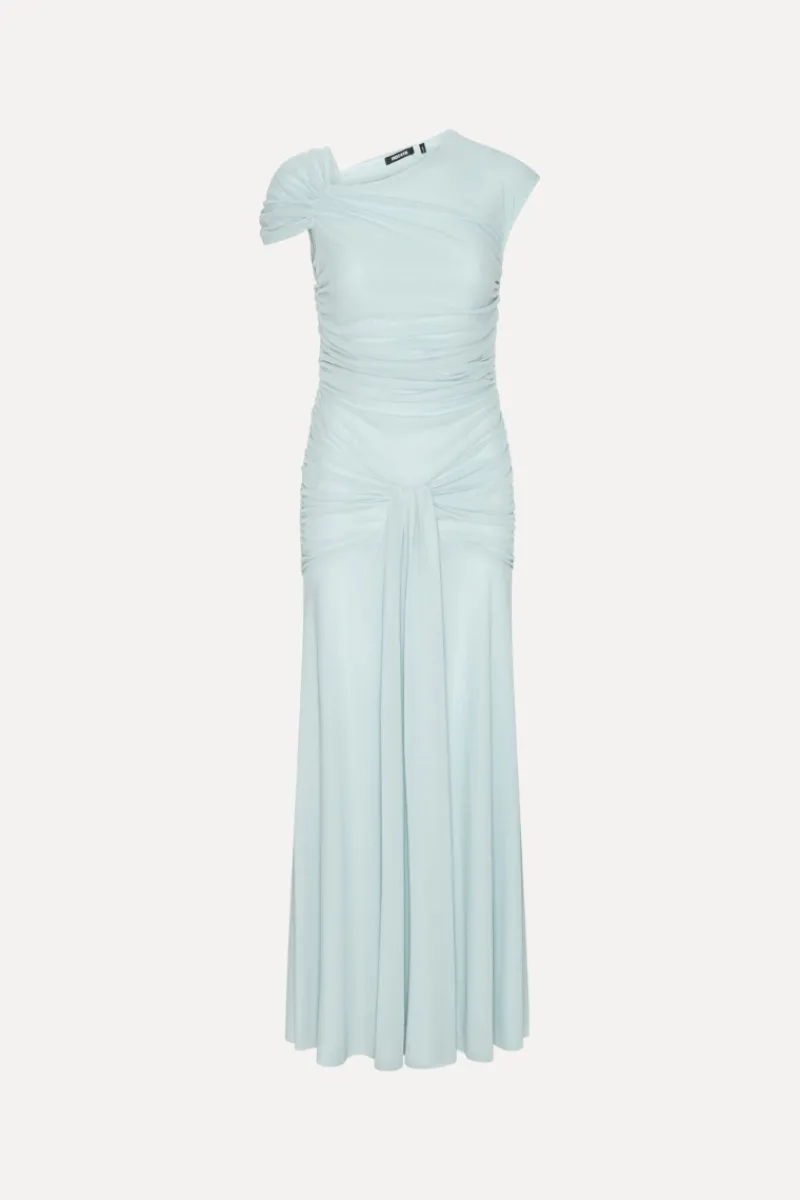 Maxi Asymmetric Dress Light Blue is a one-shoulder maxi dress with an asymmetric neckline and a softly draped silhouette. The design features gathered detailing through the bodice and waist, creating a ruched effect that continues into a fluid, floor-length skirt. A central draped knot detail at the front adds dimension to the silhouette.