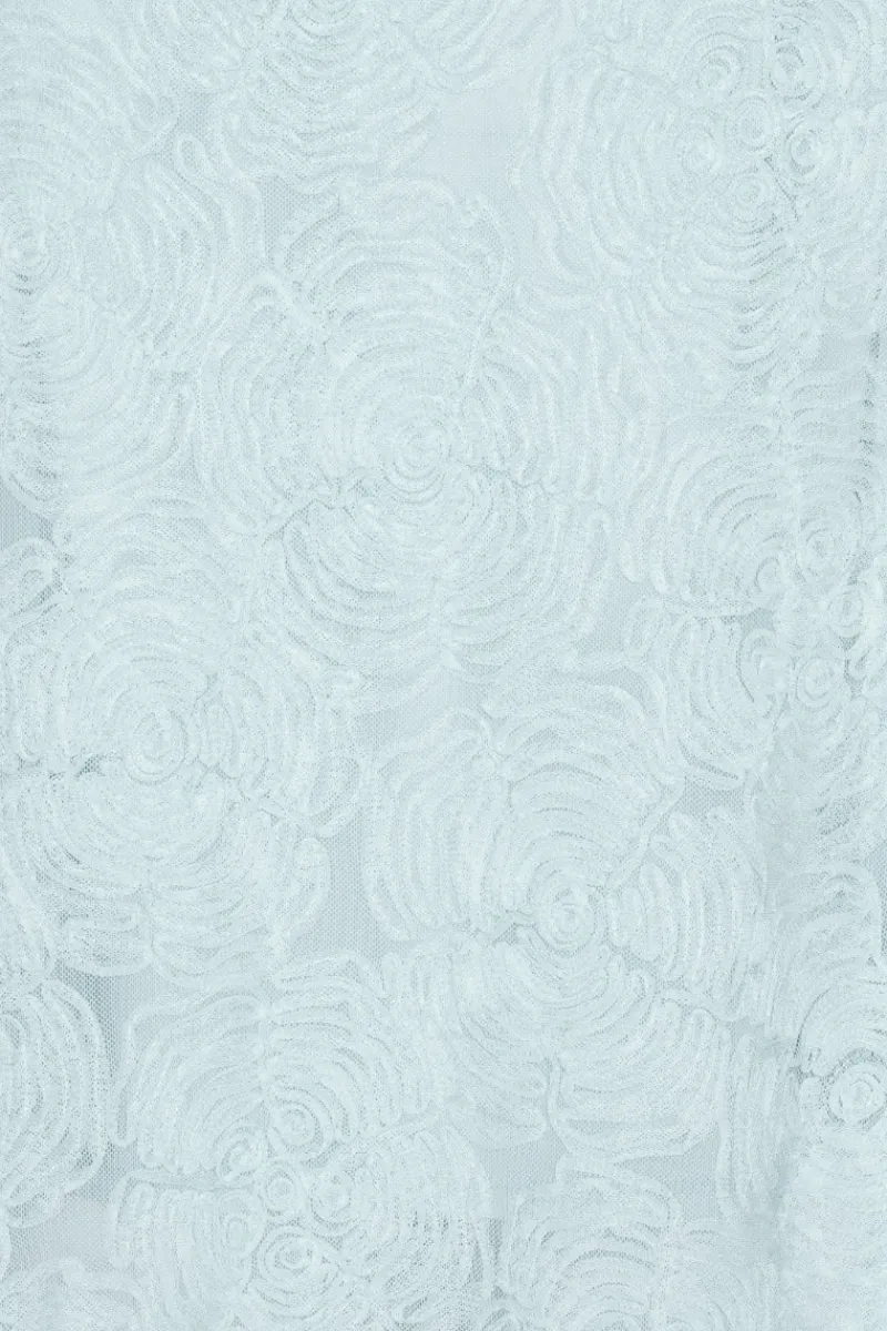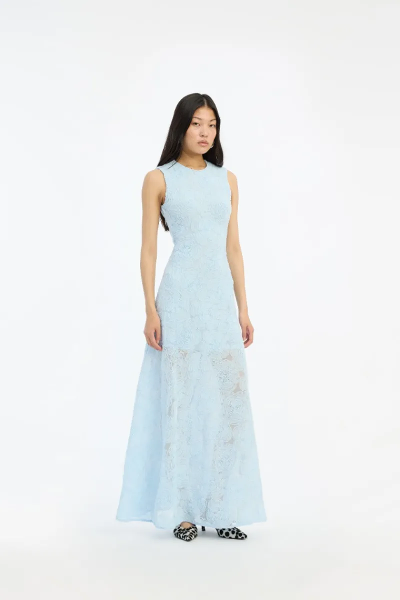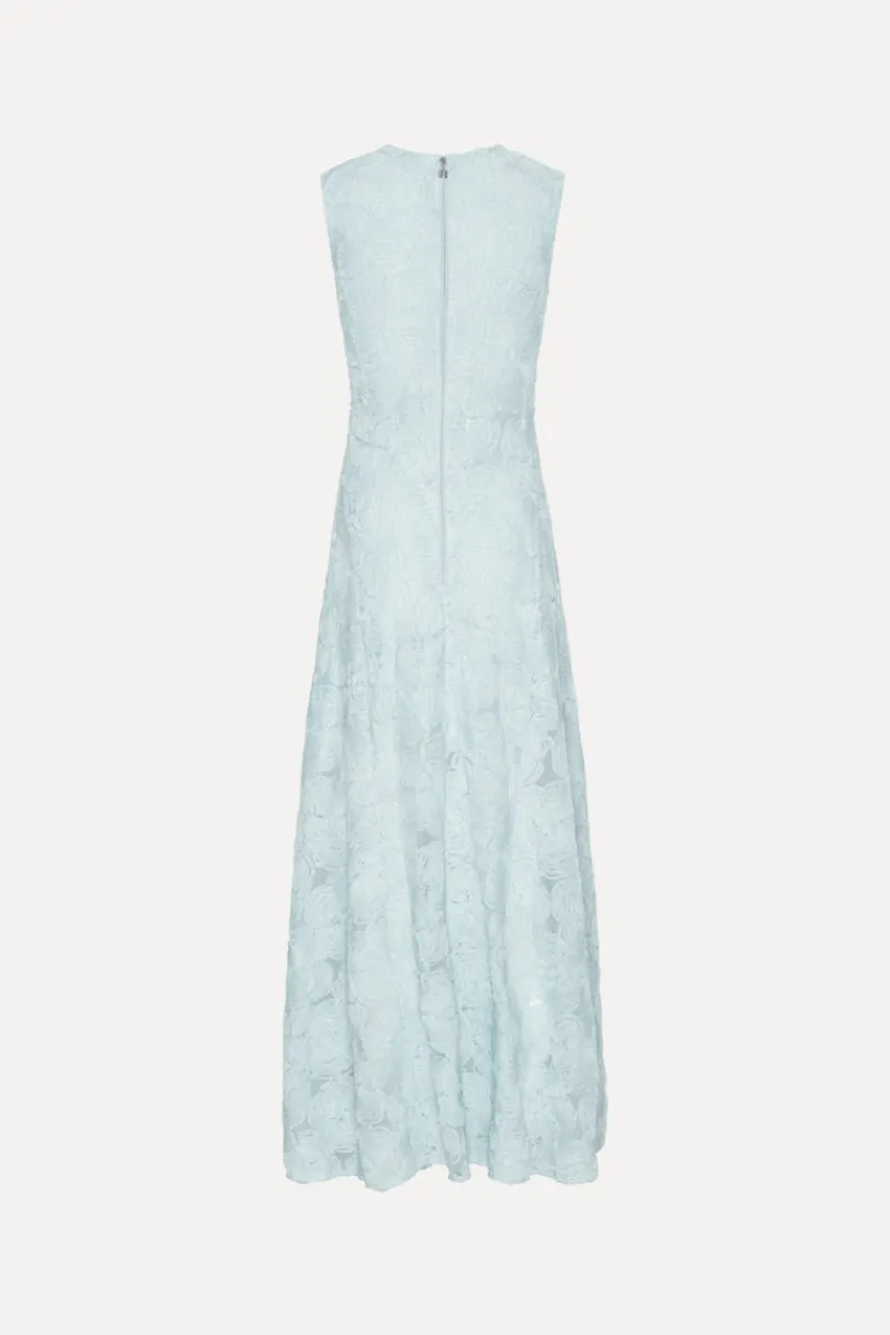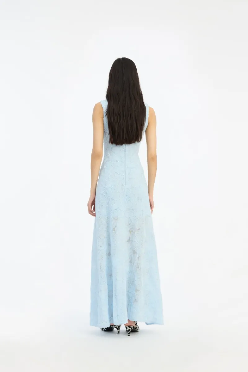 Mesh Maxi Dress Blue is a sleeveless maxi dress with a round neckline and a fitted waist that flows into a softly flared skirt. The design features an all-over textured mesh surface with a floral pattern, creating a light and dimensional appearance. A clean back zip closure completes the silhouette.