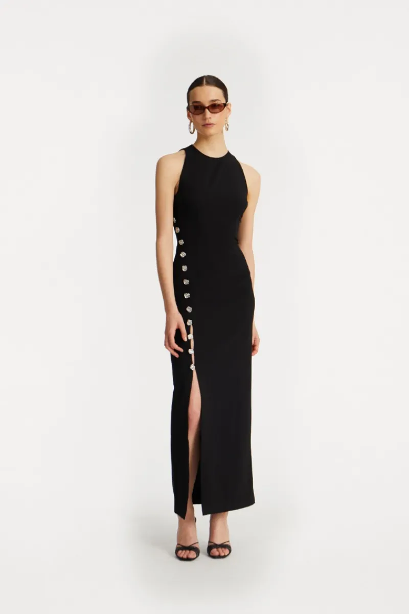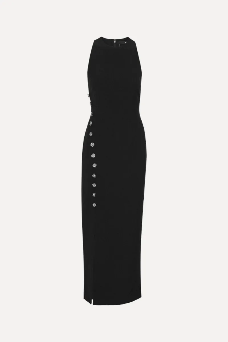 Crepe Button Dress Black features a streamlined silhouette with a concealed back zipper. The hemline falls to a mid-length and maintains a structured finish.