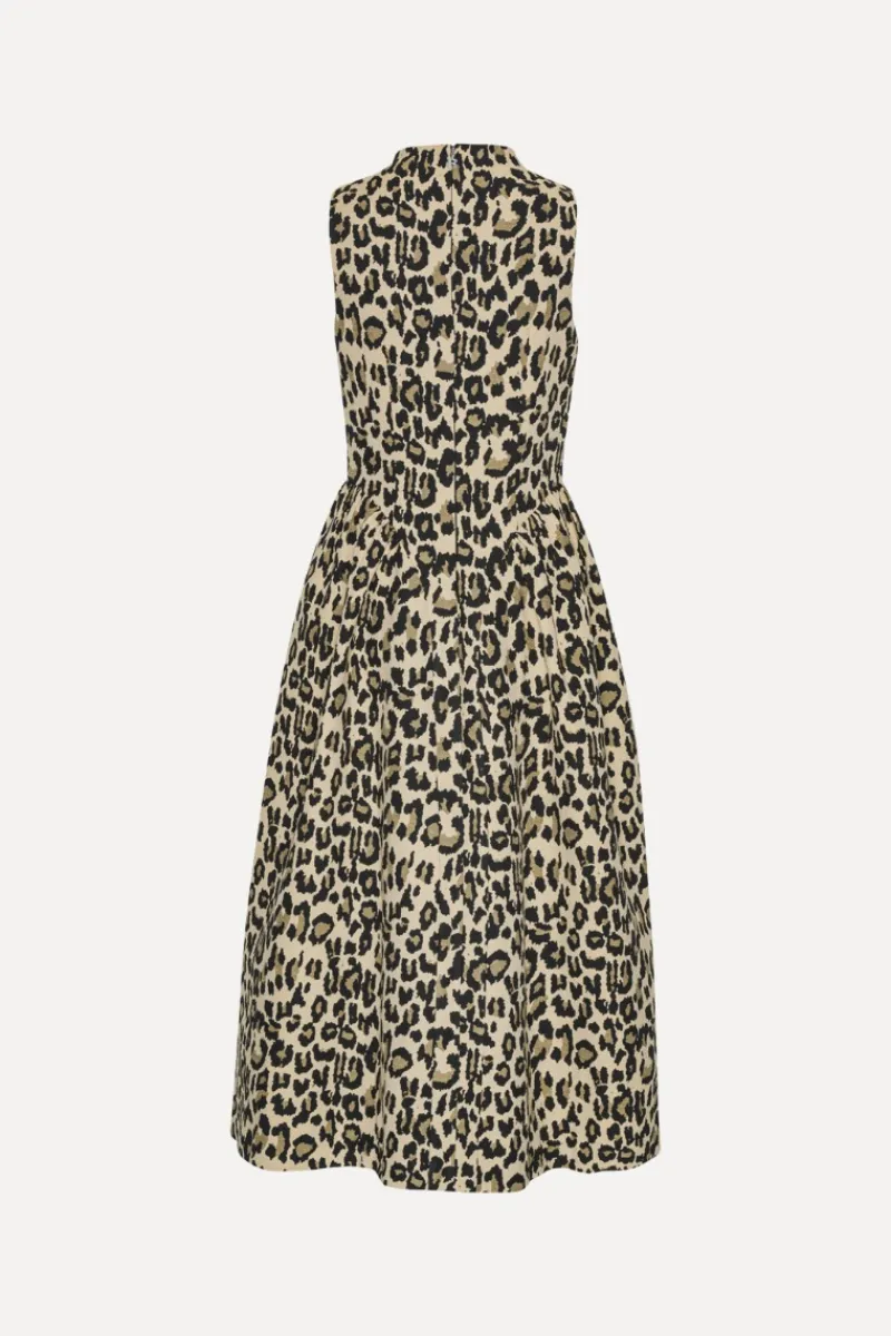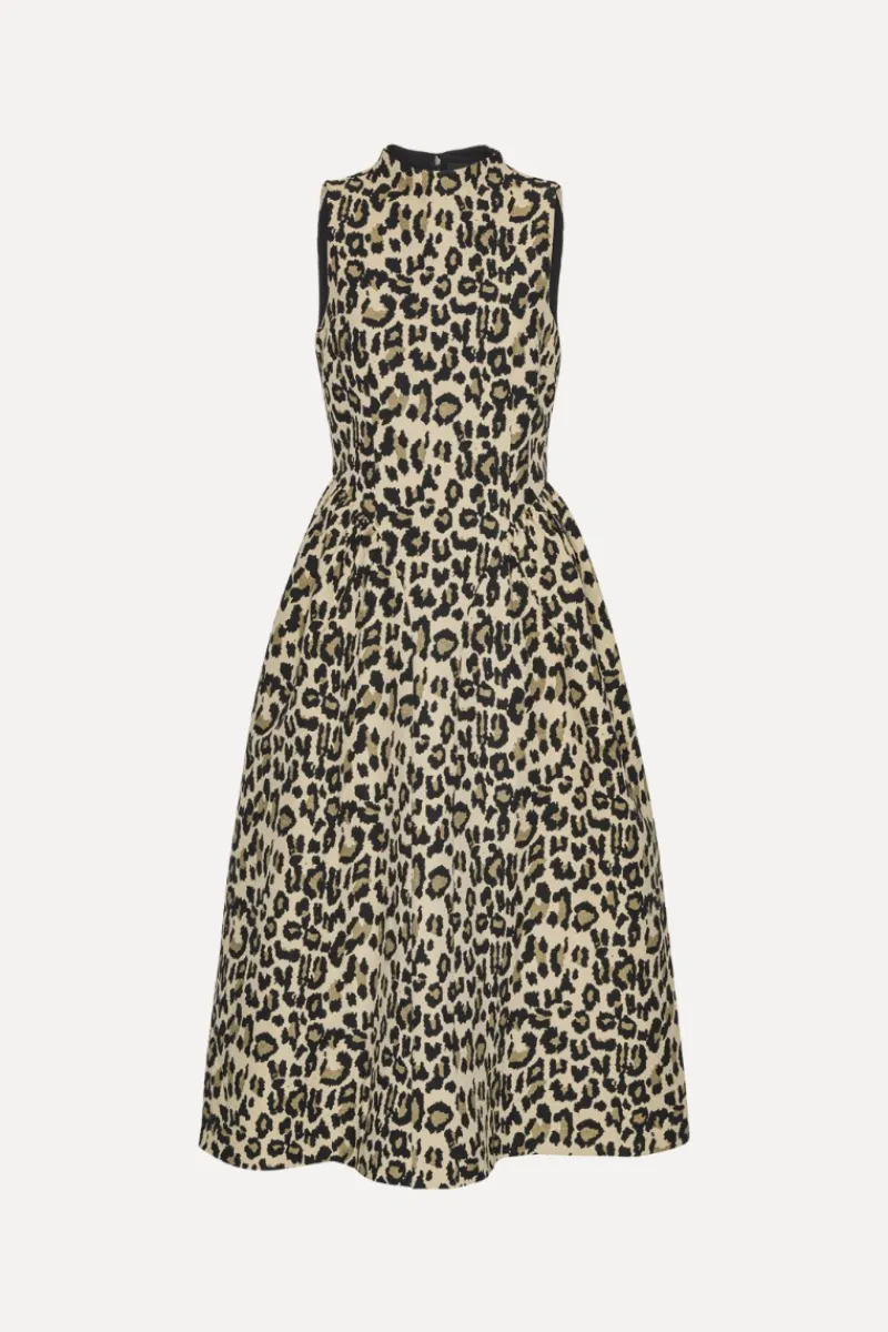 Jacquard Midi Dress Leopard Print is a sleeveless midi dress with a fitted bodice and a voluminous pleated skirt. It features a high neckline and a concealed zip fastening at the back. The dress is made from a jacquard-woven fabric with an all-over leopard print and is lined.