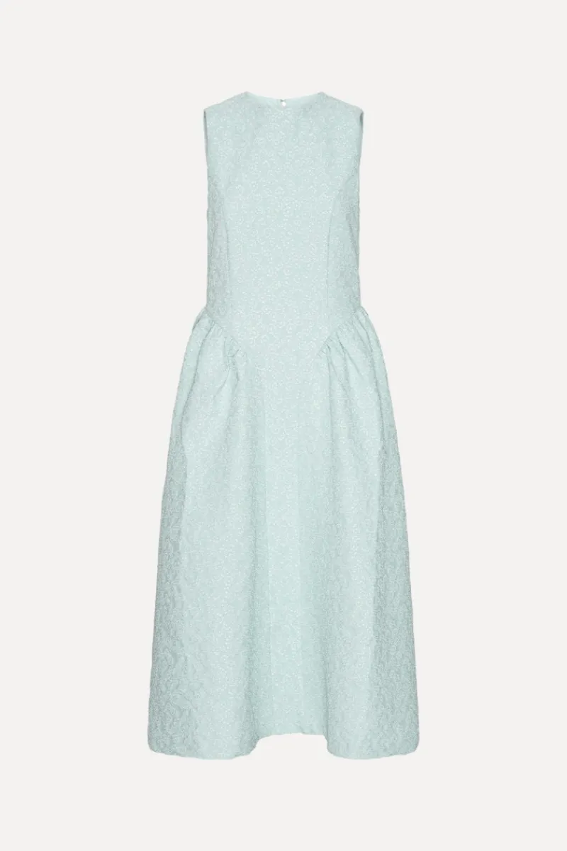 Jacquard Midi Dress Light Blue is a sleeveless midi dress crafted from textured jacquard with an all-over floral pattern. The dress features a fitted bodice with a round neckline and a defined waist that opens into a softly gathered skirt, creating volume through the lower silhouette. The structured surface highlights the woven texture of the fabric.